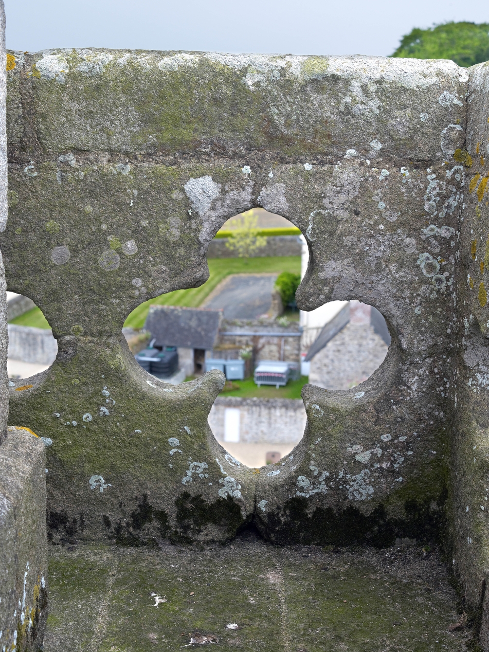 Minihy-Tréguier, rue de l'Église : église Saint-Yves, détail du garde-corps en granite du clocher, quadrilobe ou "quatre-feuilles"Immatriculation