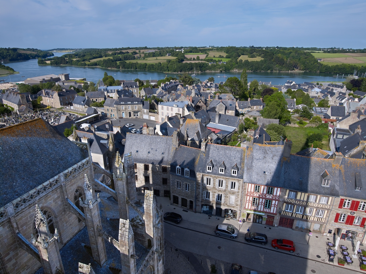 Nord-est de la place du Martray depuis la tour des cloches de la cathédrale Saint-Tugdual, débouché de la rue Renan. A l'arrière-plan, la rivière du Jaudy rejoint le Guindy pour former la rivière de TréguierImmatriculation