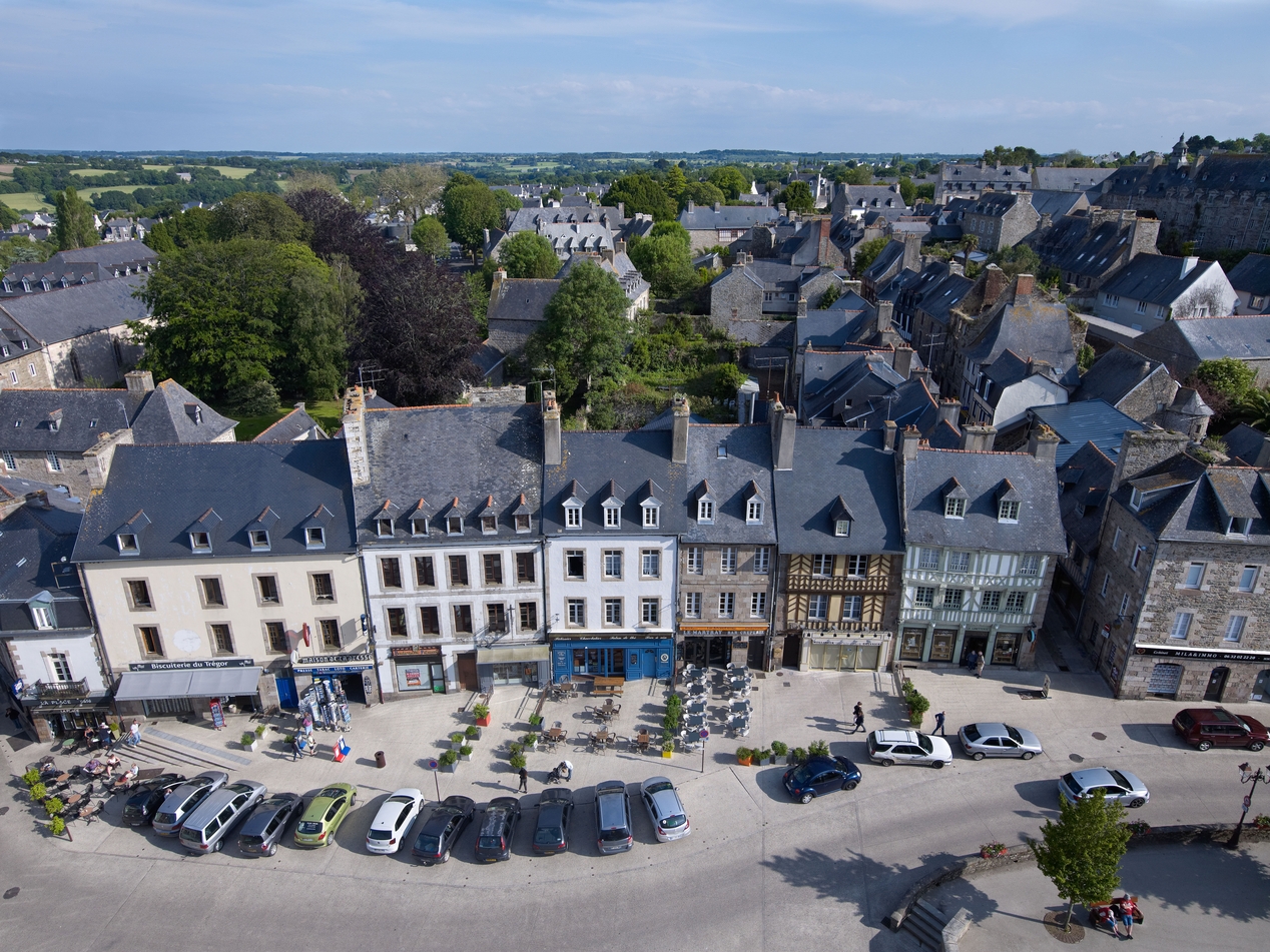 Sud de la place du Martray depuis la tour des cloches de la cathédrale Saint-Tugdual, alignement de maisons et débouché de la rue Saint-YvesImmatriculation