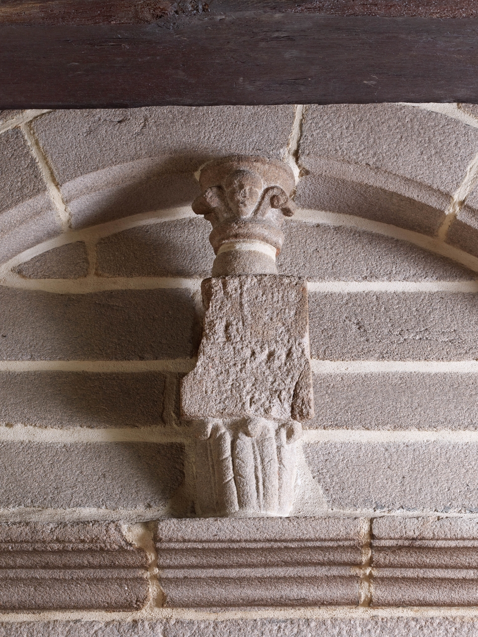 Grande salle basse, mur de refend en pierre de taille de granite, détail du dessus de la cheminée, armoiries et chapiteau déplacé (hotte en glacis sous arc mouluré)Immatriculation