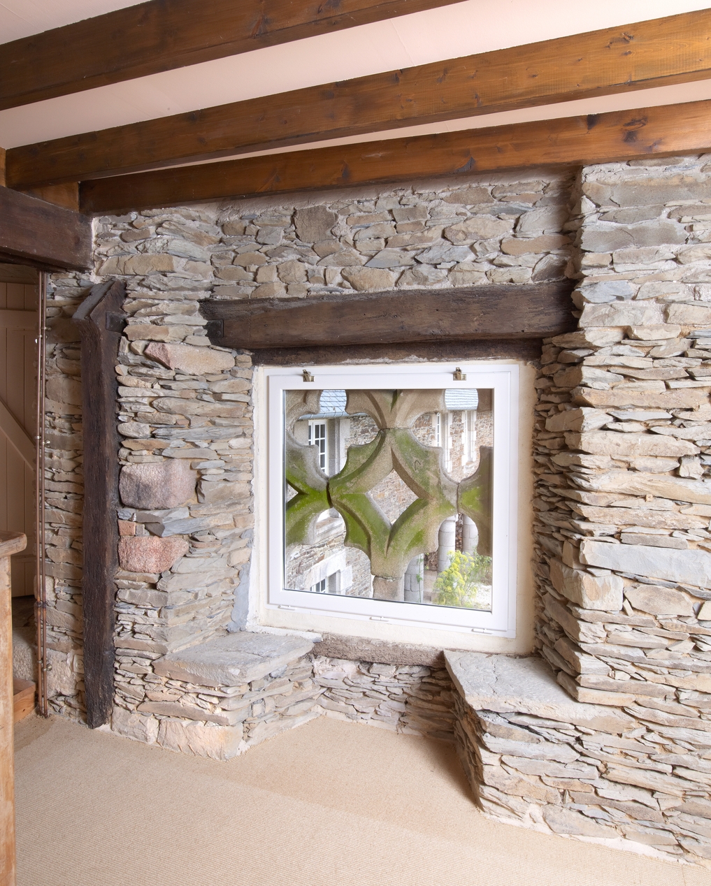 Premier étage, détail de l'une des deux fenêtres orientées vers la cour au nord (partie supérieure d'une grande baie gothique en remploi comprenant quadrilobes et trilobes). Au premier plan, coussiègesImmatriculation