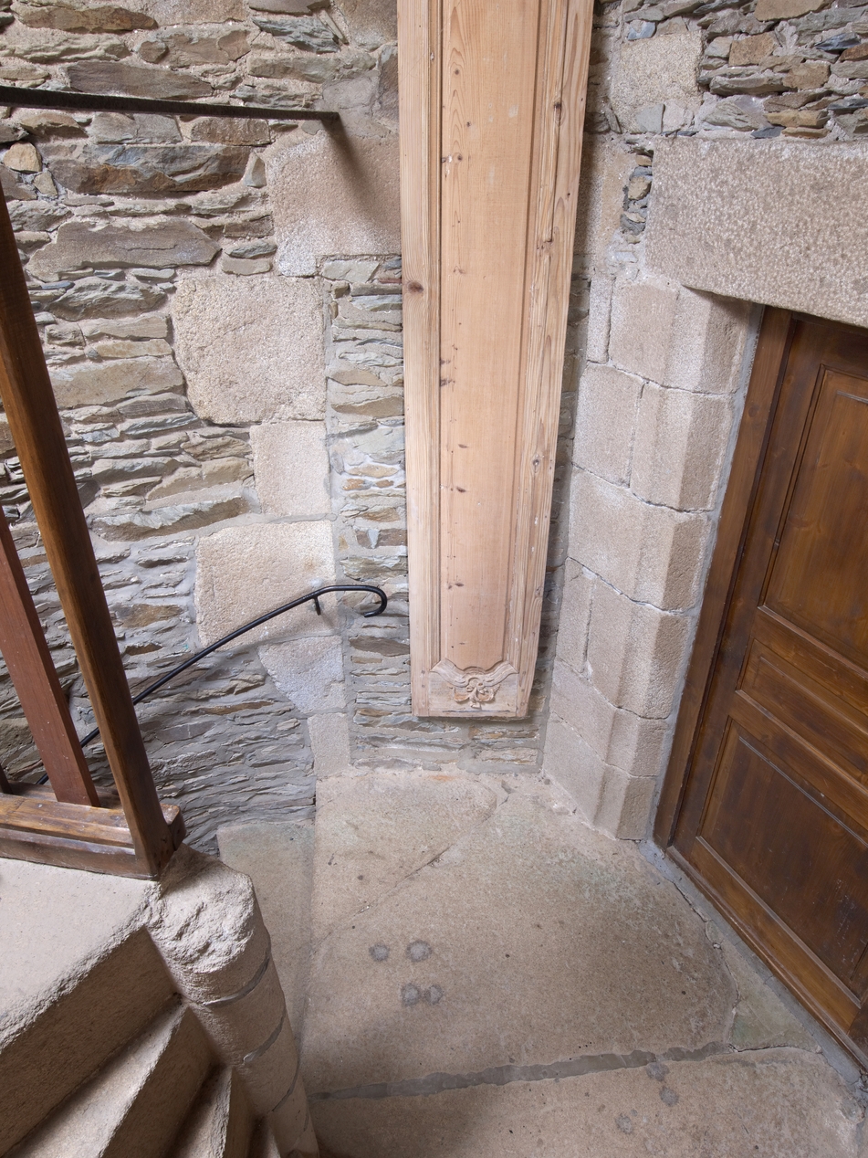 Tour nord, escalier en vis en granite, détail du palier du premier étage, portes à linteau droit (l'une d'entre elles est murée)Immatriculation