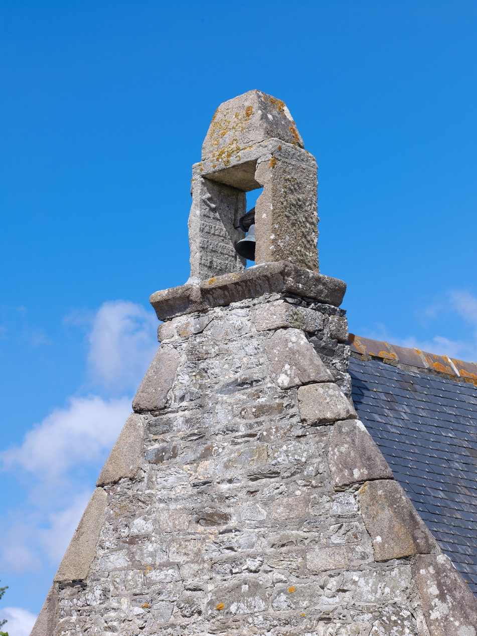 Vue de l'élévation ouest, détail du clocheton abritant une cloche. Le clocheton est constitué d'éléments de remploi : pierres tombales et socle de croix (?)Immatriculation