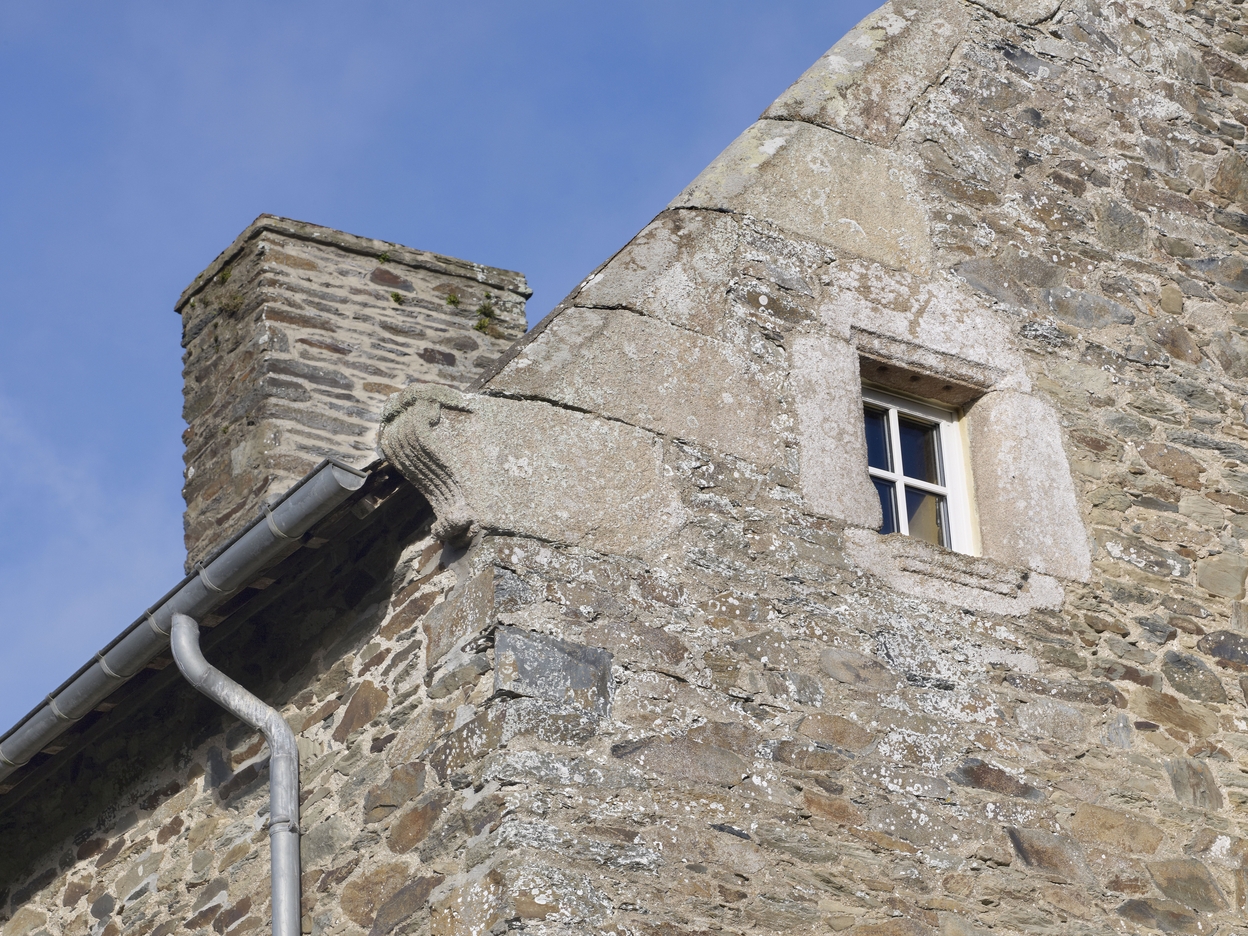 Pignon est, détail des rampants, de la chevronière ou crossette sculptée et d'une petite baie située au niveau de l'étage de combleImmatriculation