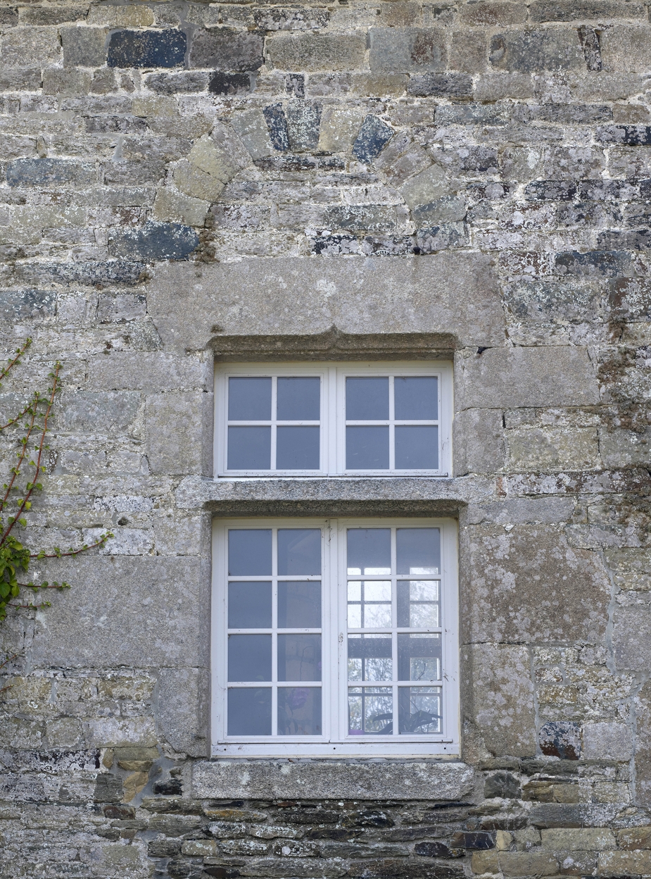 Elévation nord, détail de l'une des fenêtres. Le linteau, orné d'une petite accolade, est surmonté d'un arc de décharge. Si elle a conservé sa traverse, la baie a probalement perdu son meneau vertical. La partie basse - allège - a fait l'objet d'un remontageImmatriculation