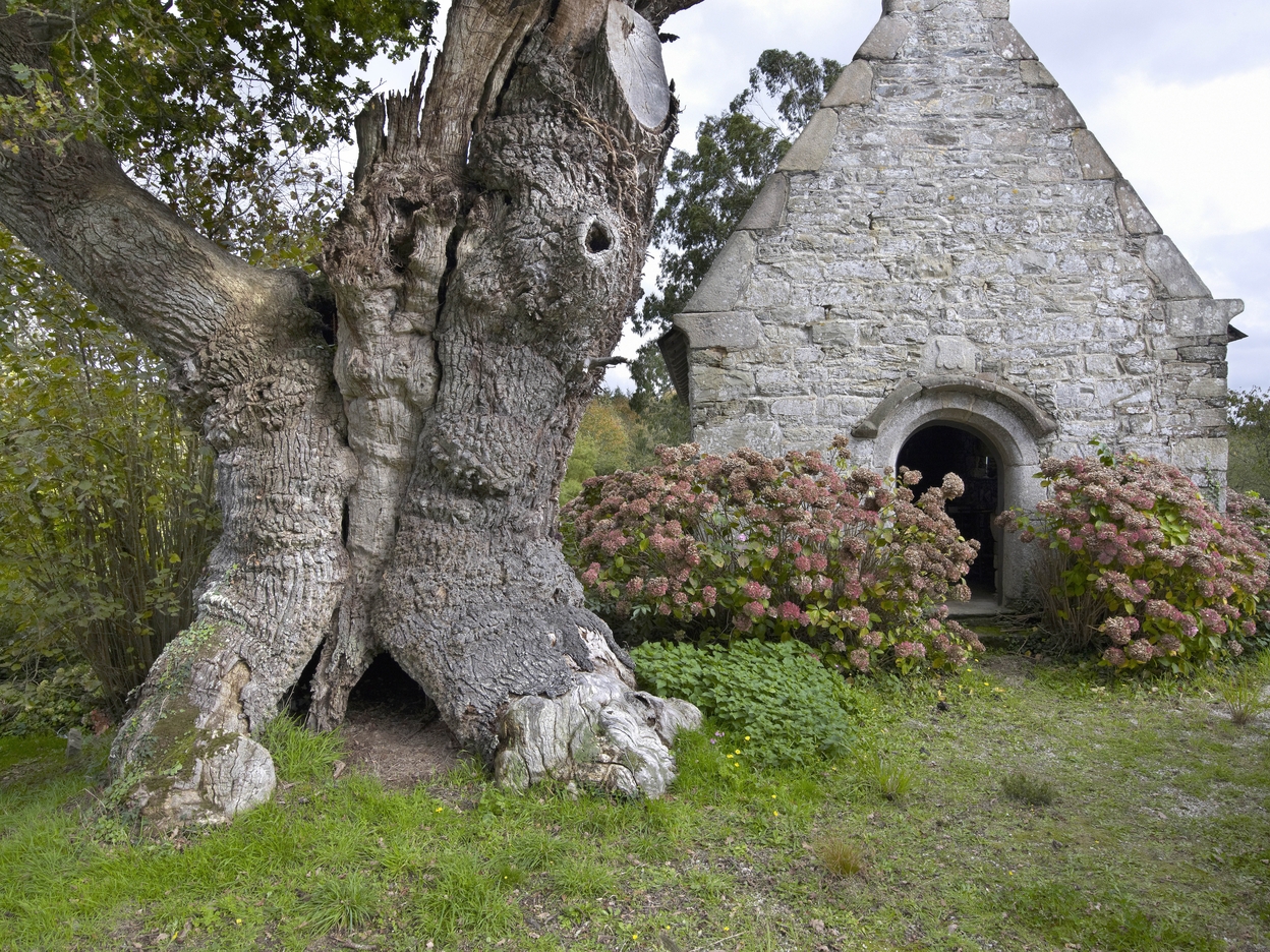 Vue générale de la chapelle depuis l'ouest. Au premier plan à gauche, un chêne quasi millénaireImmatriculation