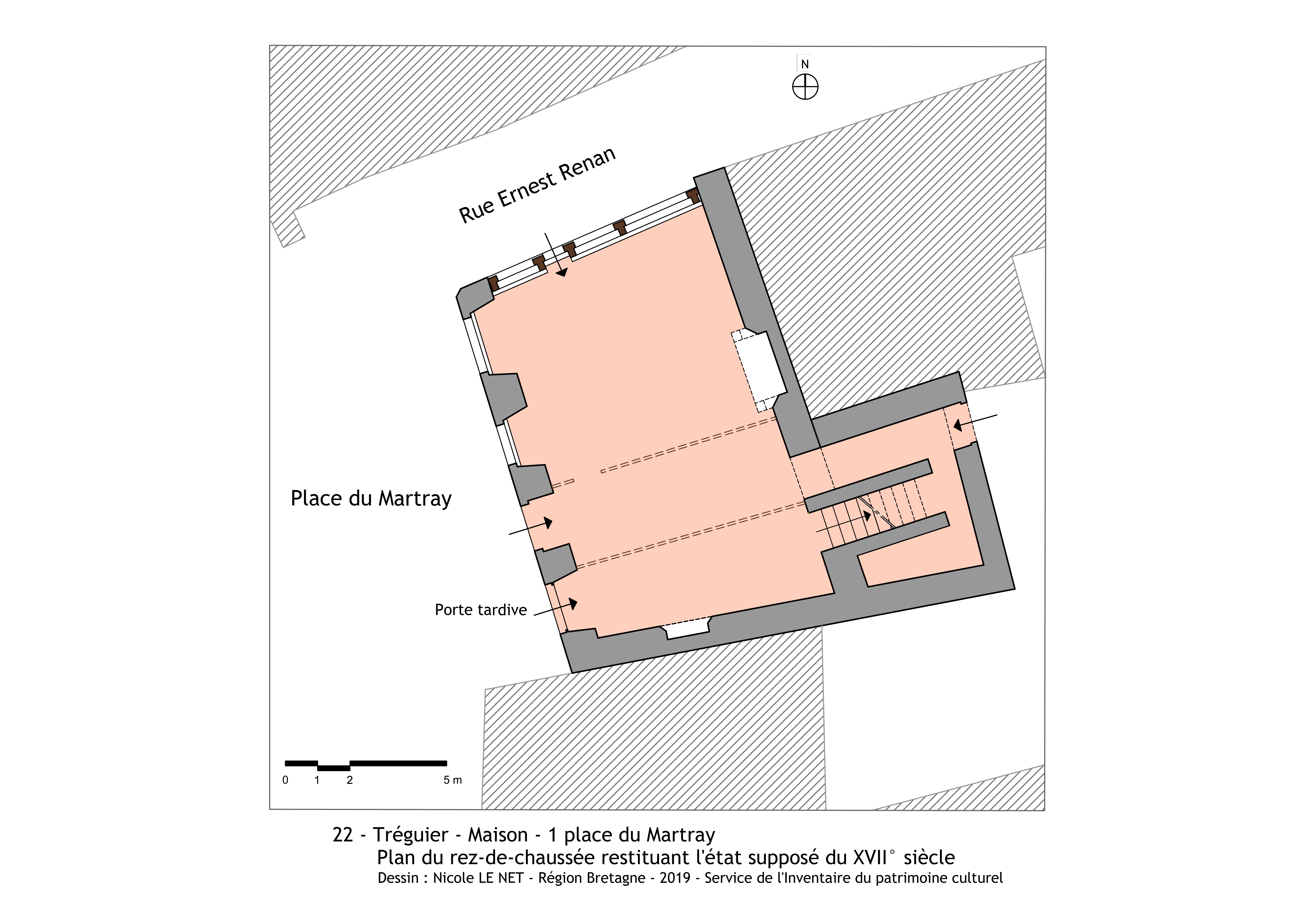 Plan du rez-de-chaussée restituant l'état supposé du 17e siècle : cloison suplémentaire ménageant un accés indépendant vers le nouveau corps de logis sur courImmatriculation
