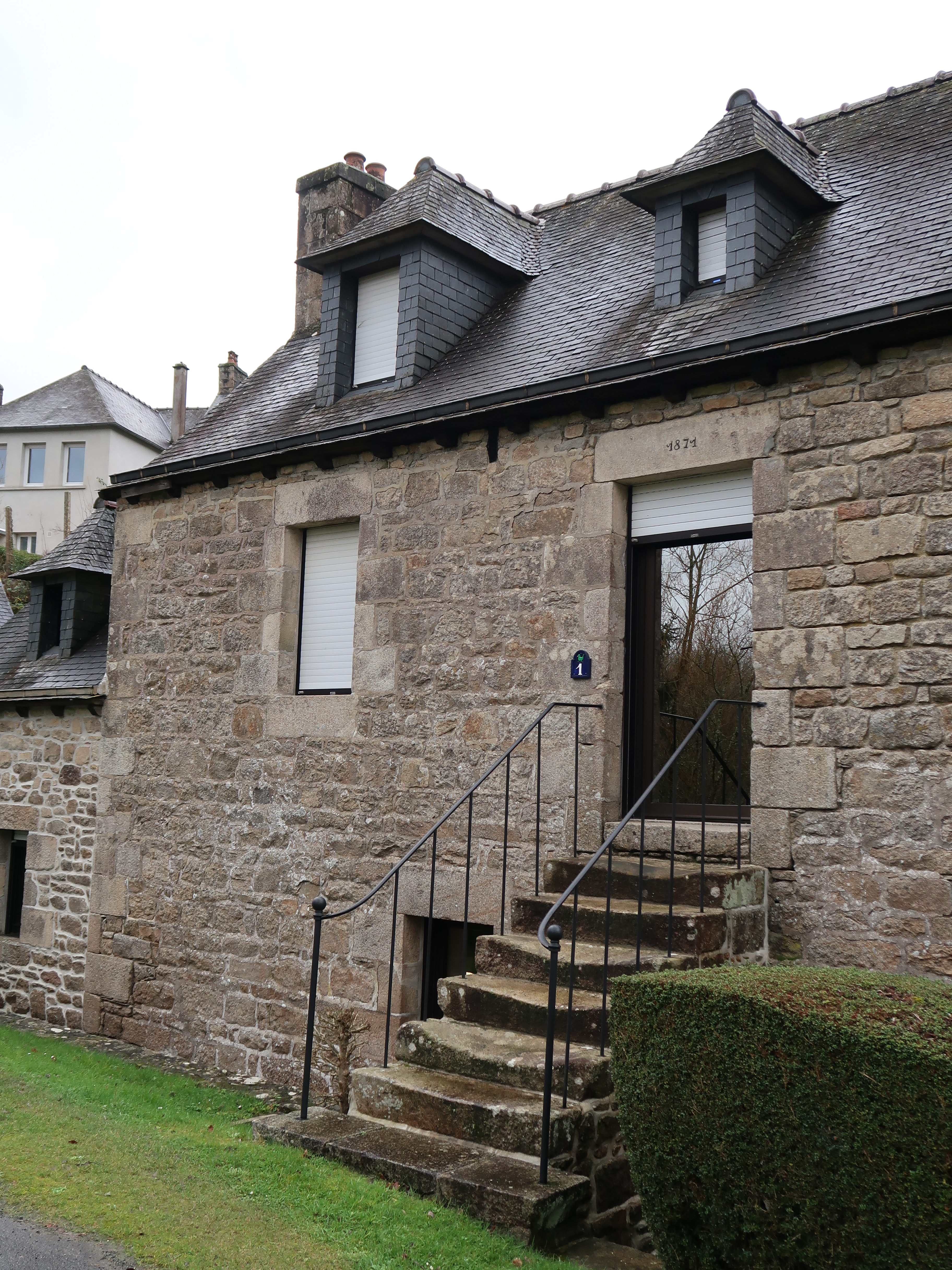 Loguivy-Plougras, le bourg : Moulin à eau de Traou an Dour, détail de l'élévation est (linteau portant le millésime "1871")Immatriculation