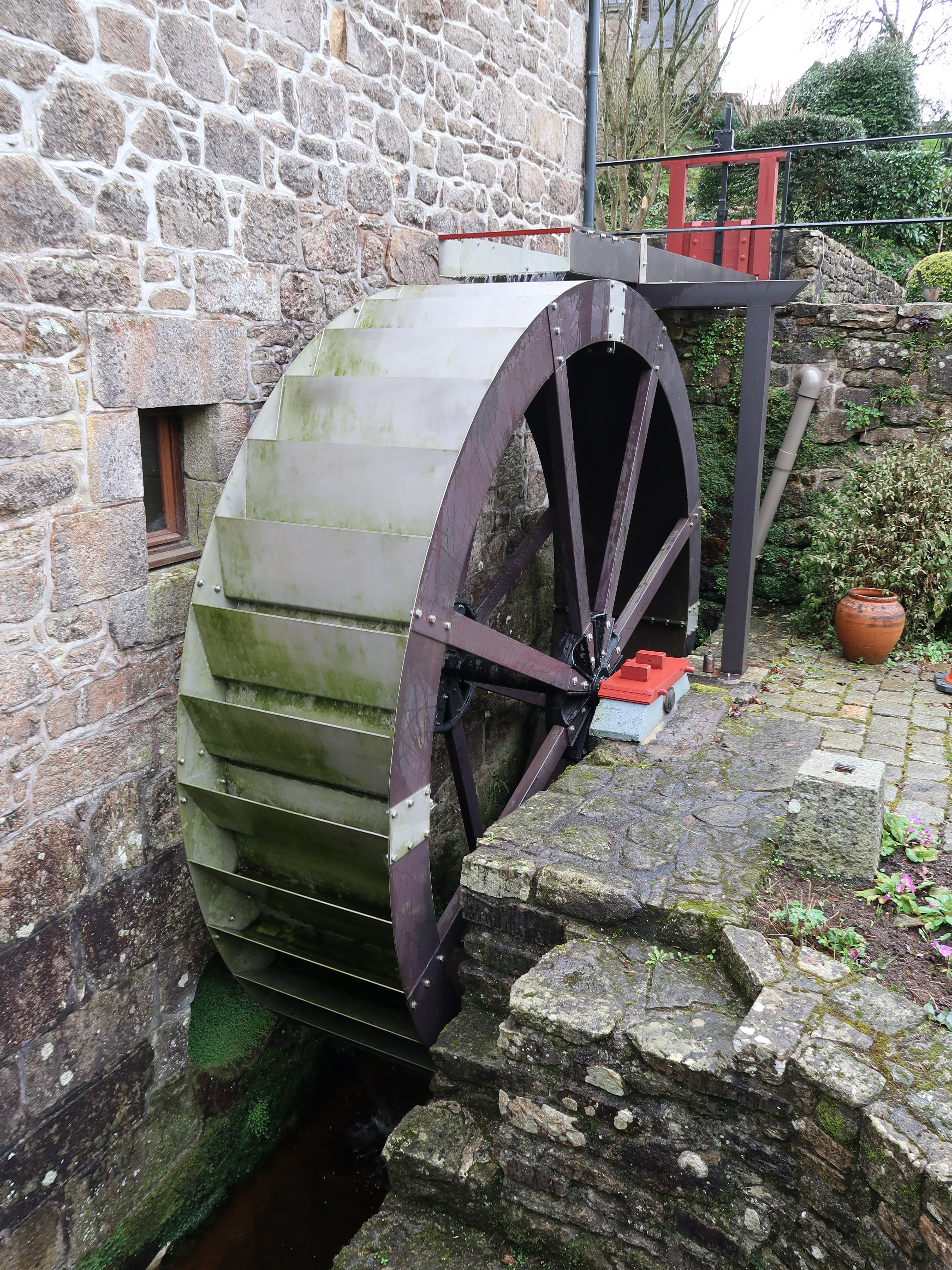 Loguivy-Plougras, le bourg : Moulin à eau de Traou an Dour, pignon nord, détail de la roue à aubesImmatriculation