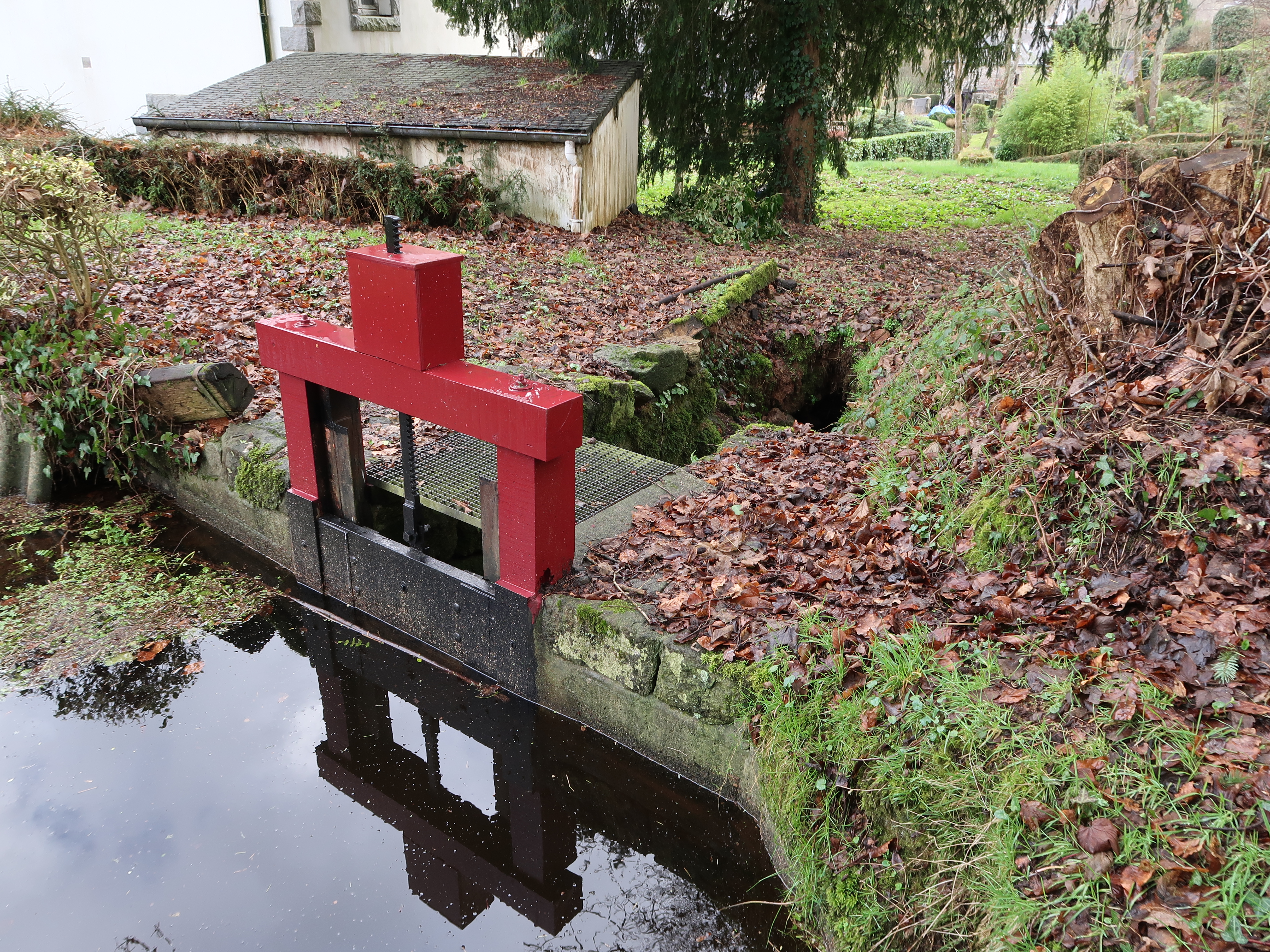 Loguivy-Plougras, le bourg : Moulin à eau de Traou an Dour, entrée de la rigole du canal d’amenée (vanne permettant de réguler ou fermer l'alimentation en eau depuis l'étang)Immatriculation