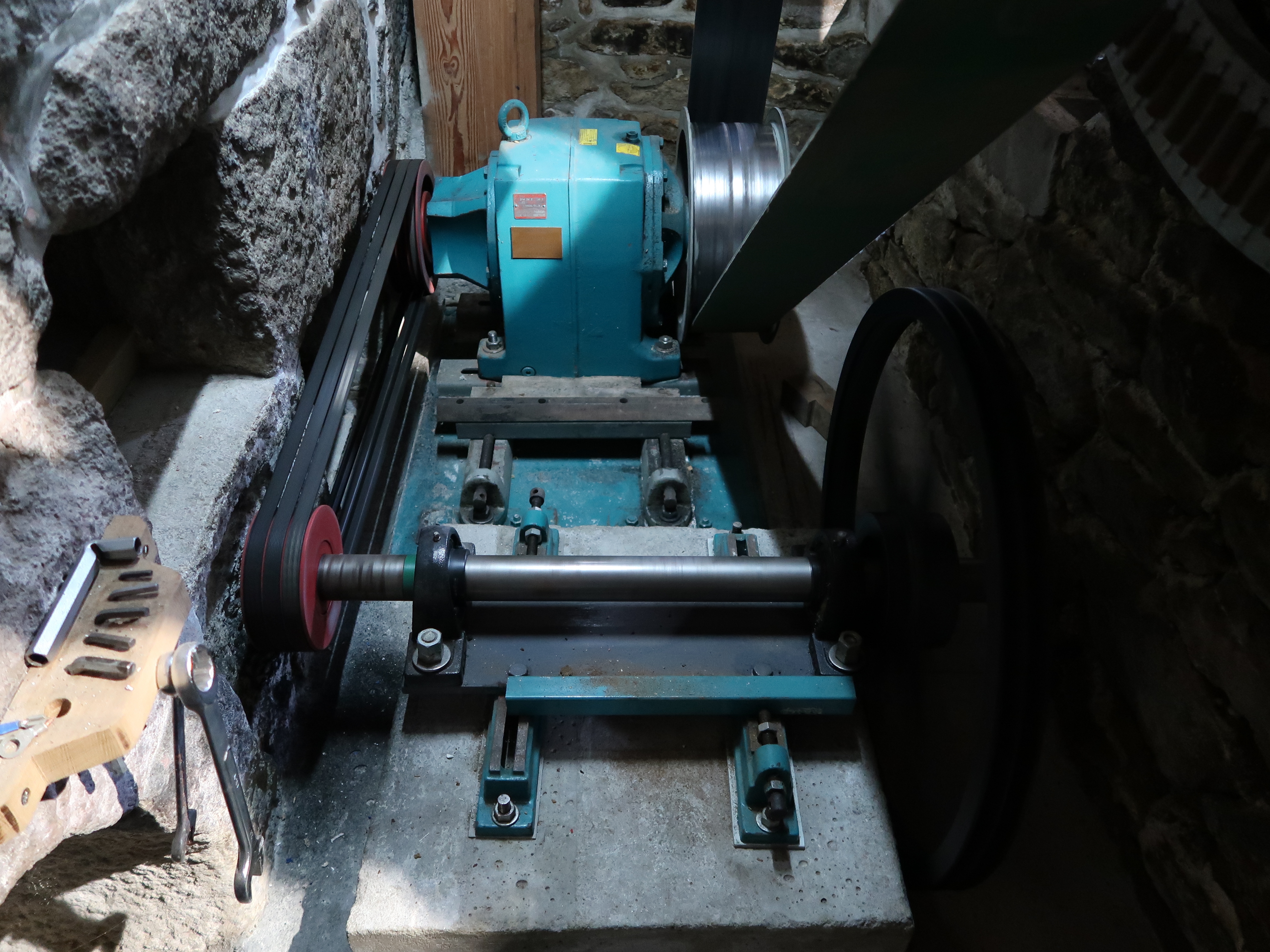 Loguivy-Plougras, le bourg : Moulin à eau de Traou an Dour, détail des mécanismes de transmission (alternateur)Immatriculation