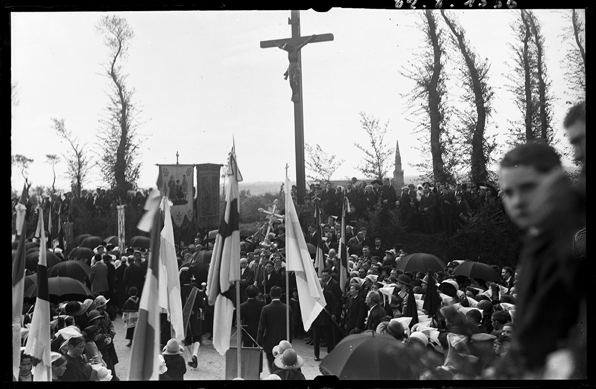 Minihy-Tréguier, le pardon de Saint-Yves par Raphaël Binet, vers 1920-1929. En arrière-plan, le clocher de l'église de Minihy-TréguierImmatriculation