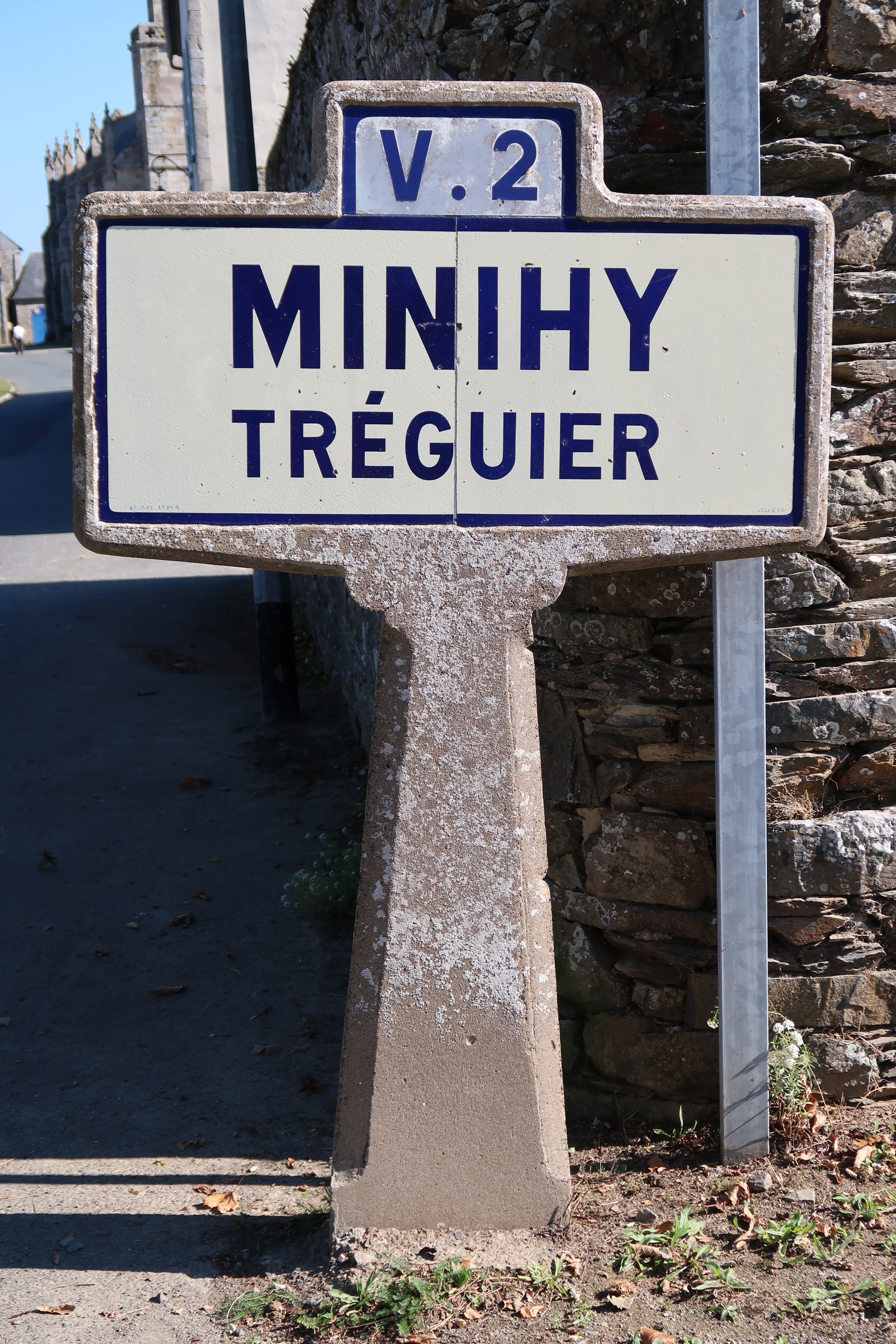 Minihy-Tréguier, rue de l'Église : panneau d'entrée d'agglomération en béton arméImmatriculation