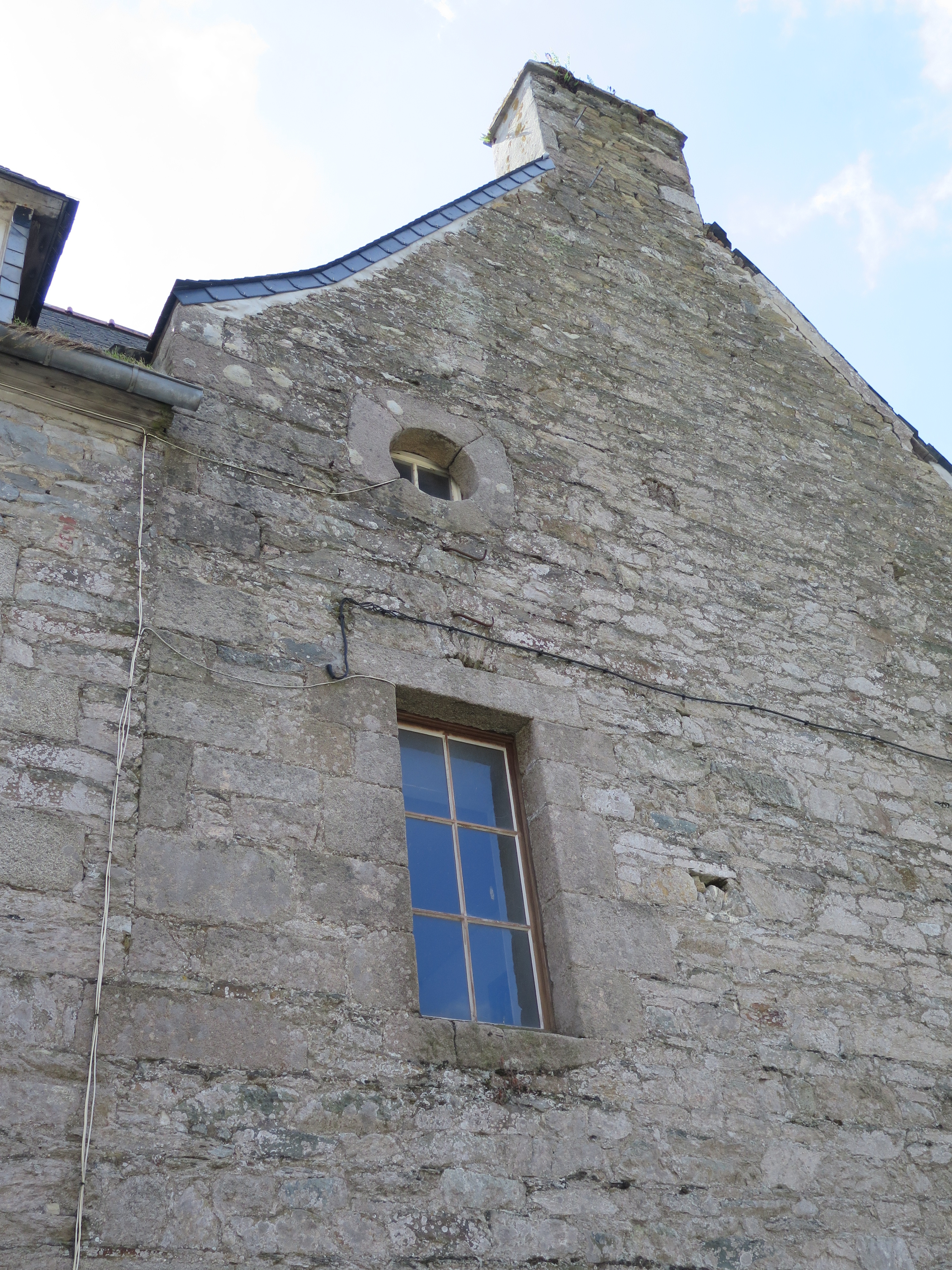 Tréguier, 9 rue des Perdreries (Perderies) : maison dite "Scolasticat", logis principal, pignon nord donnant côté rue, détail d'une fenêtre et d'un oculus, état en 2017Immatriculation