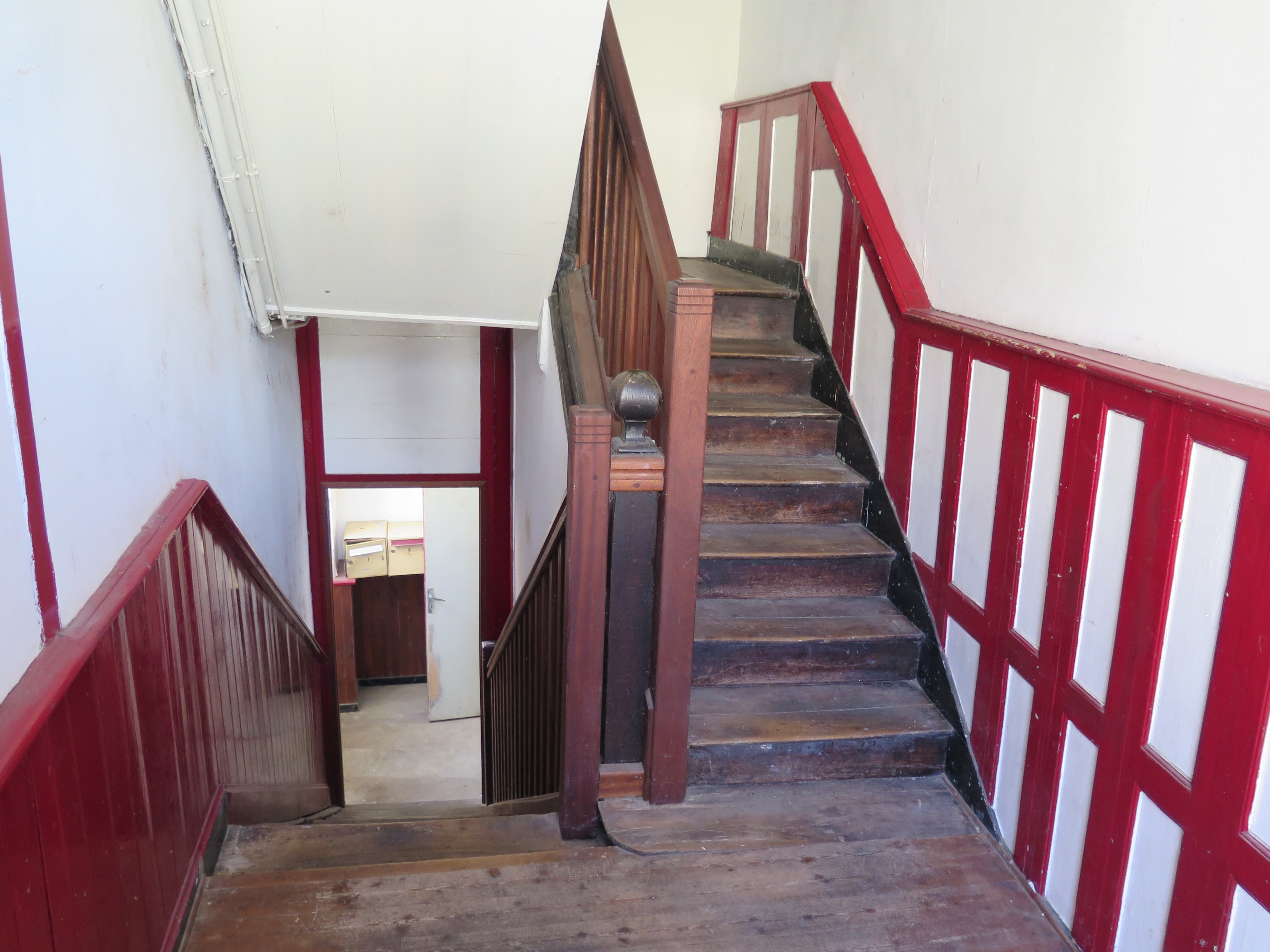 Tréguier, 9 rue des Perdreries (Perderies) : maison dite "Scolasticat", logis principal, détail de l'escalier (les balustres ont disparu)Immatriculation