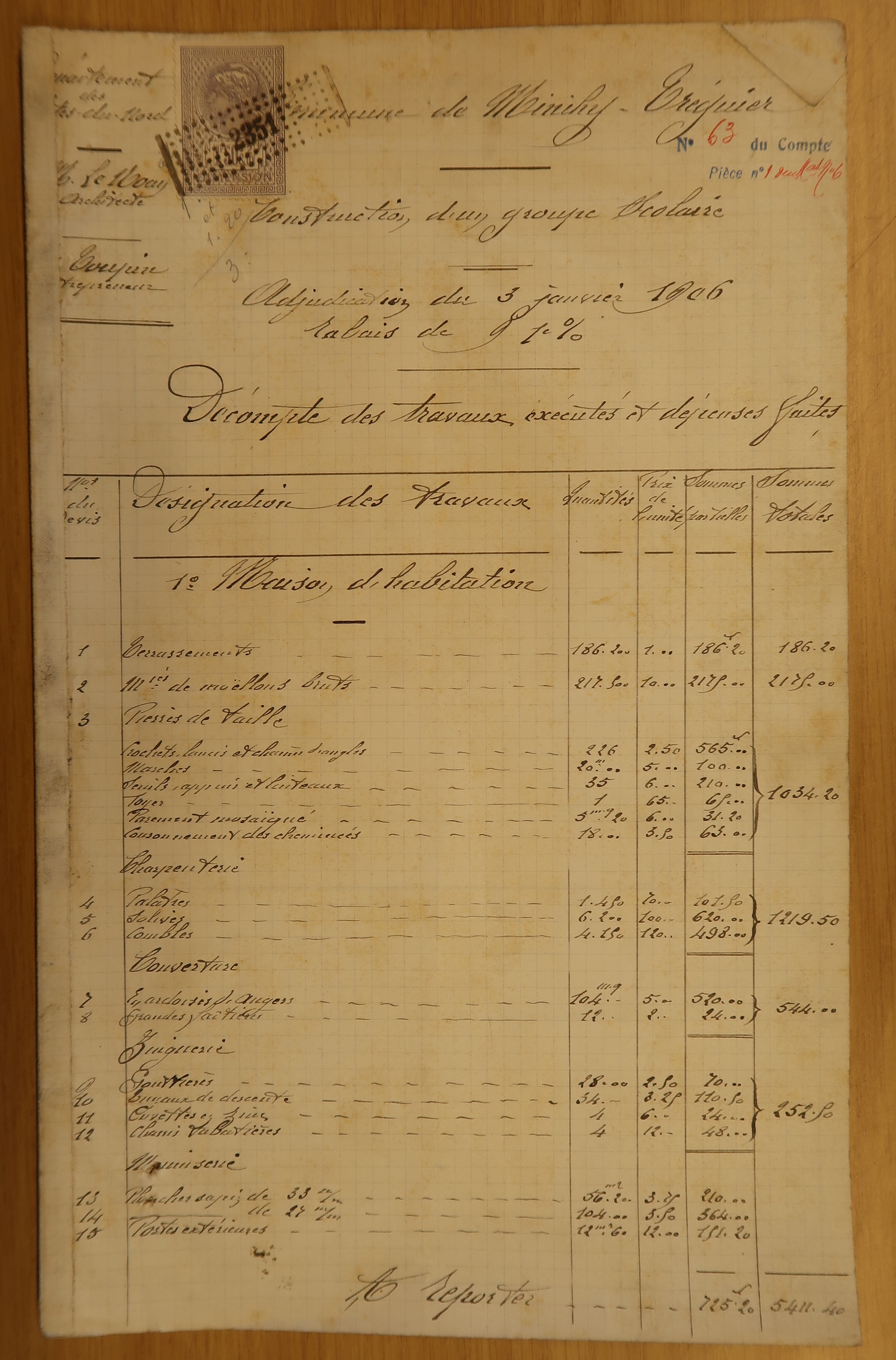 Reproduction de la première page du "Décompte des travaux exécutés et dépenses faites" pour le groupe scolaire de Minihy-Tréguier, 20 février 1907 (Archives départementales des Côtes-d’Armor)Immatriculation