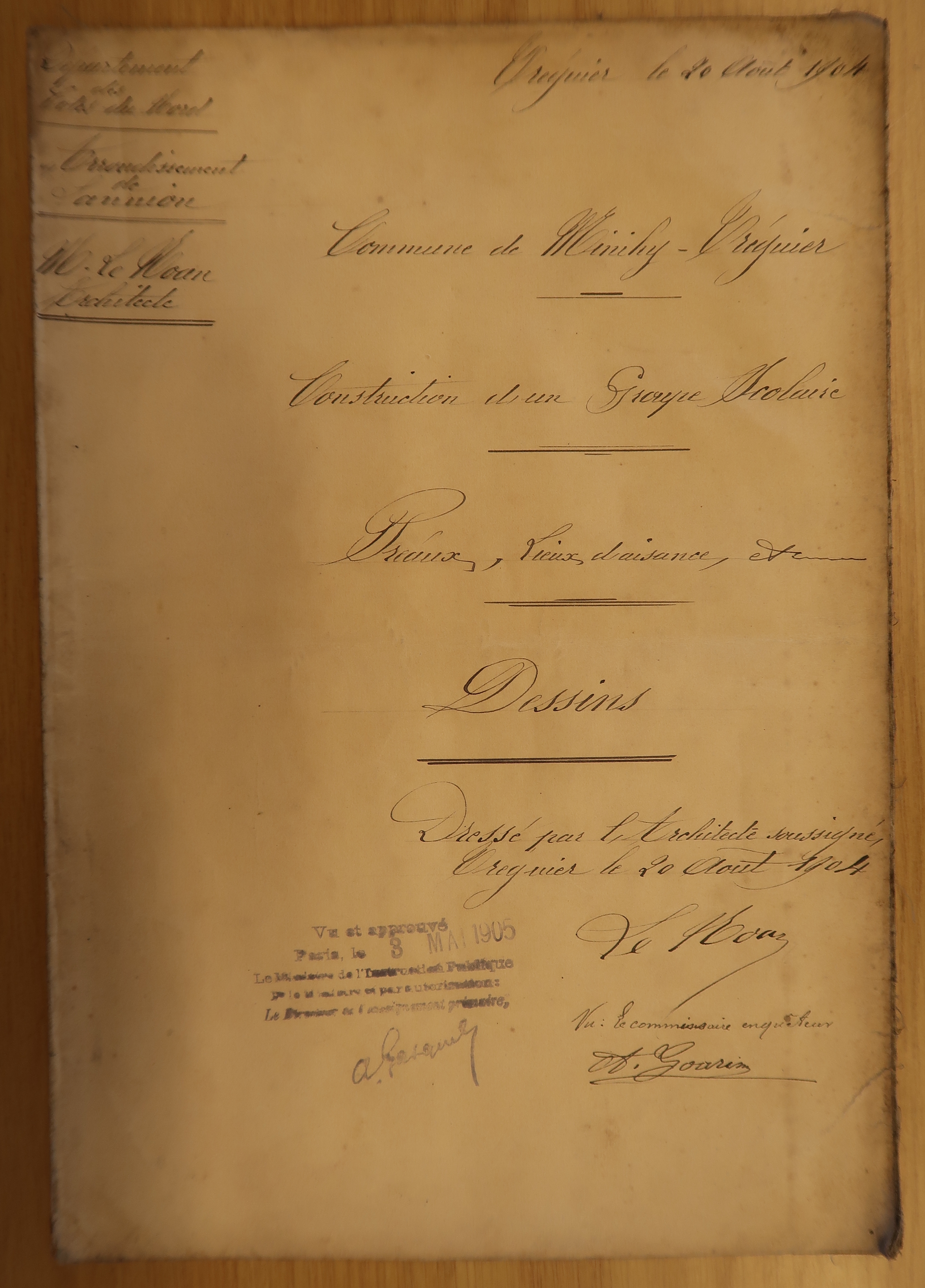 Reproduction du dossier contenant les dessins réalisés par l'architecte Le Noan, 20 août 1904 (Archives départementales des Côtes-d’Armor)Immatriculation