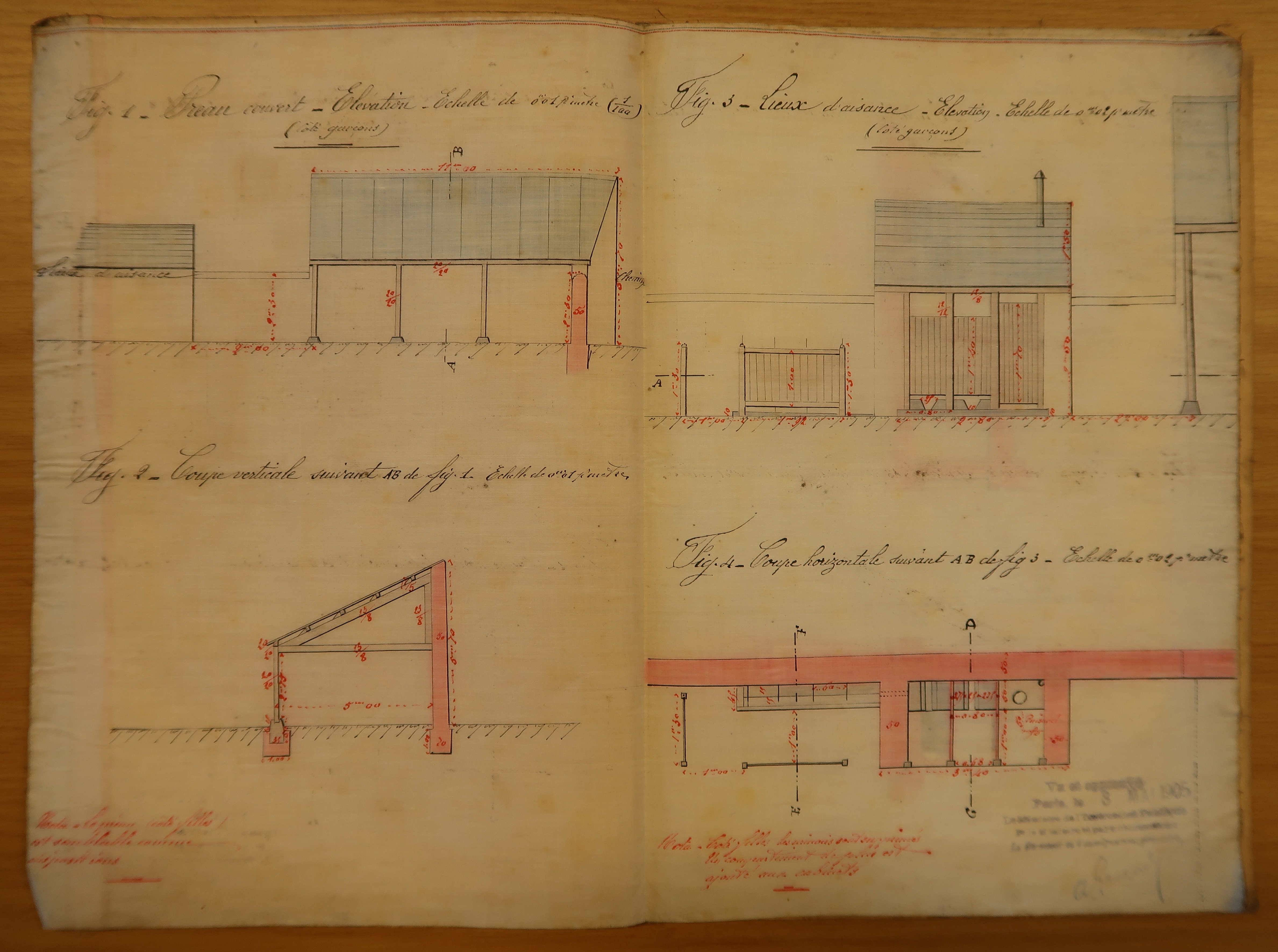 Reproduction des dessins réalisés par l'architecte Le Noan, 20 août 1904 : préau couvert et lieux d'aisance, élévations, plan et coupe (Archives départementales des Côtes-d’Armor)Immatriculation