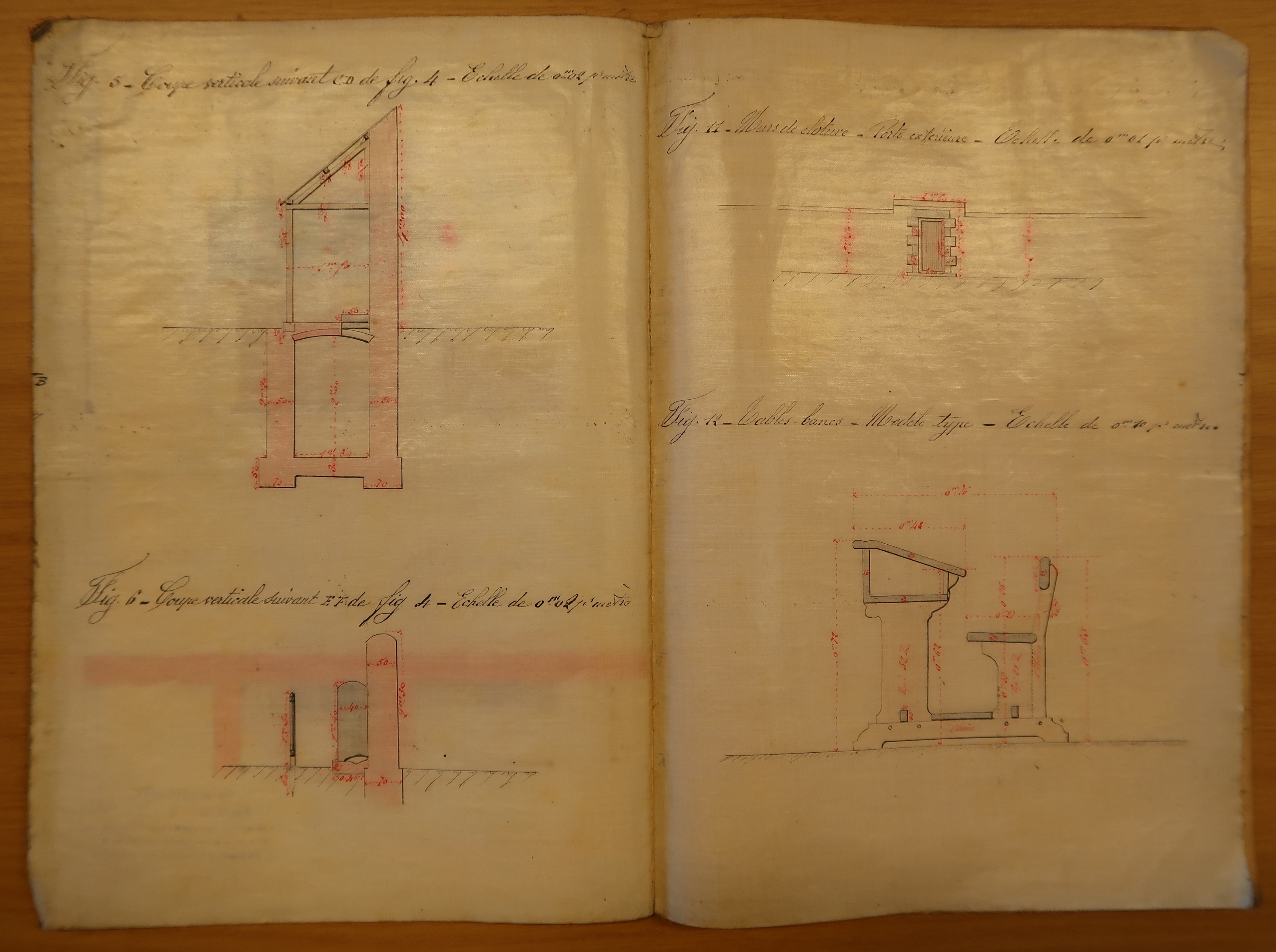Reproduction des dessins réalisés par l'architecte Le Noan, 20 août 1904 : lieux d'aisance, murs de clôture - porte extérieure et "tables bancs', élévation, plan et coupes (Archives départementales des Côtes-d’Armor)Immatriculation