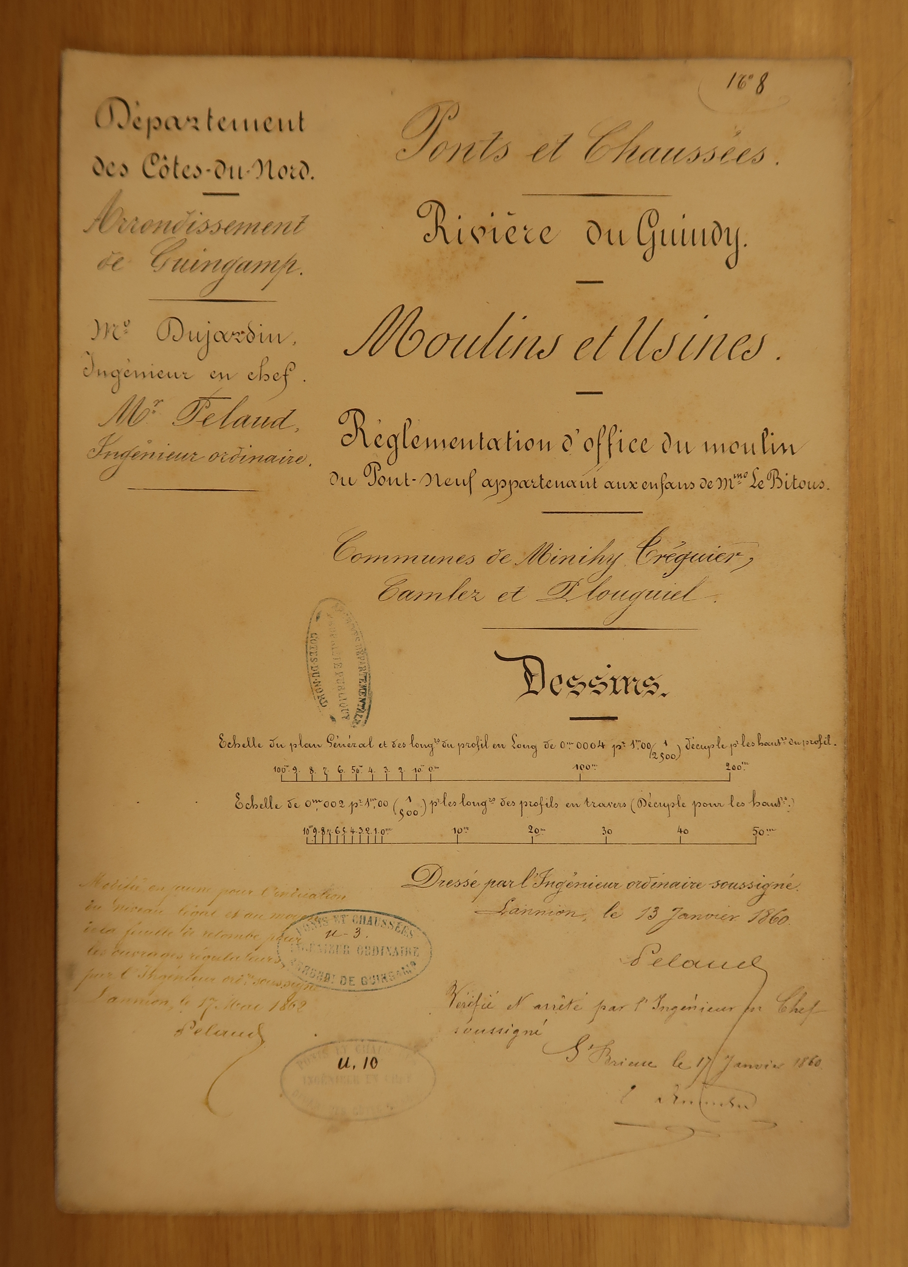 Réglementation d'office du Moulin du Pont Neuf à Minihy-Tréguier : dessins (Archives départementales des Côtes-d’Armor : 8 S 6 Guindy et affluents)