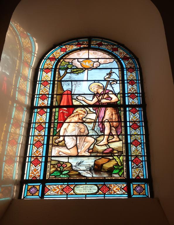 Baie 1 : le baptême du Christ, vitrail, don de Jean.M. Guigneu et de Jeanne de la Villegirouard veuve Lemoine, atelier angevin Megnen, Clamens et BordereauImmatriculation