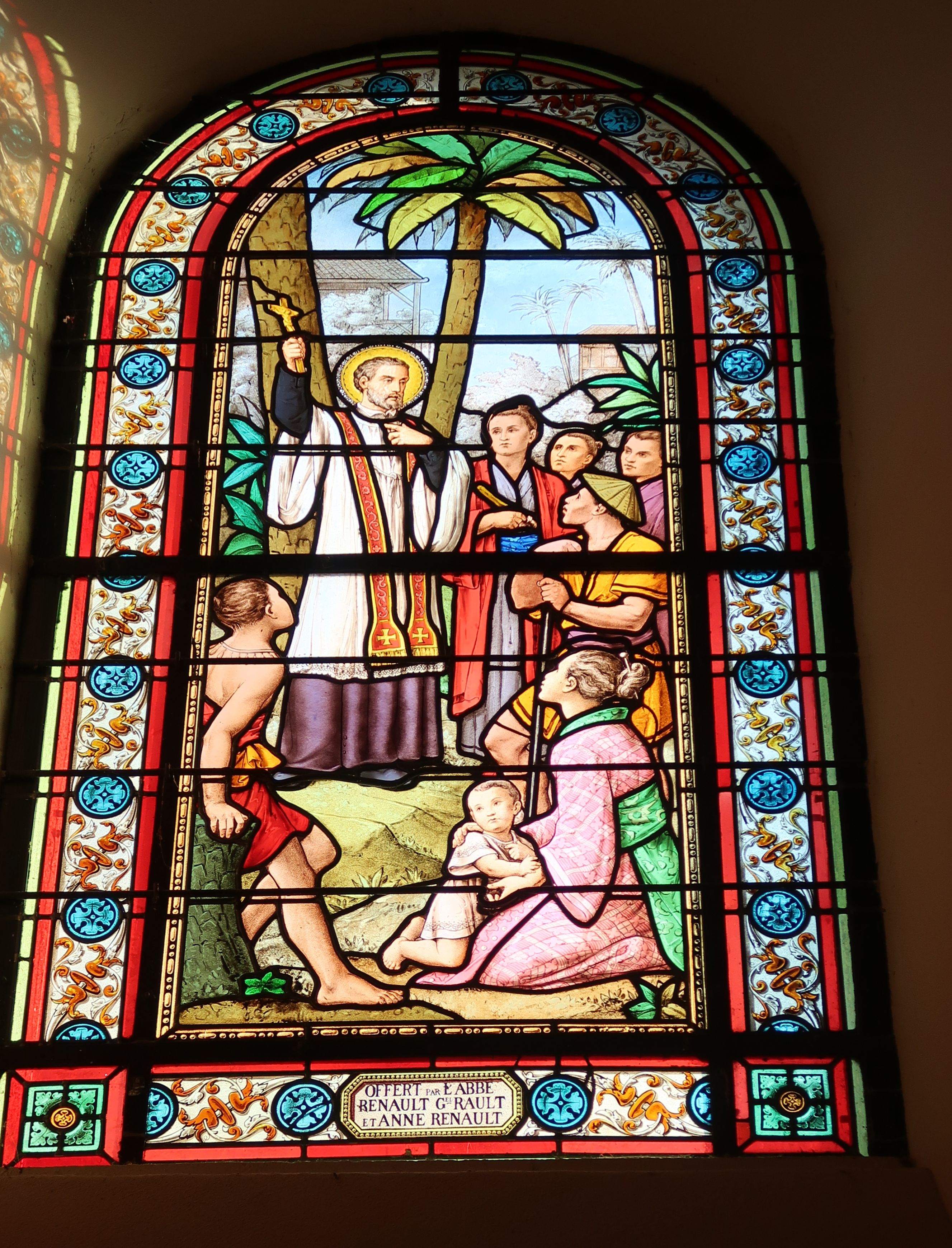 Baie 2 : mission de Saint François-Xavier, vitrail offert par l'abbé Renault Gel Rault et Anne Renault, atelier Megnen, Clamens et BordereauImmatriculation