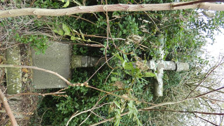 Croix de Lann Alan. Vue générale du socle et du croisillon. Etat en 2019.Immatriculation