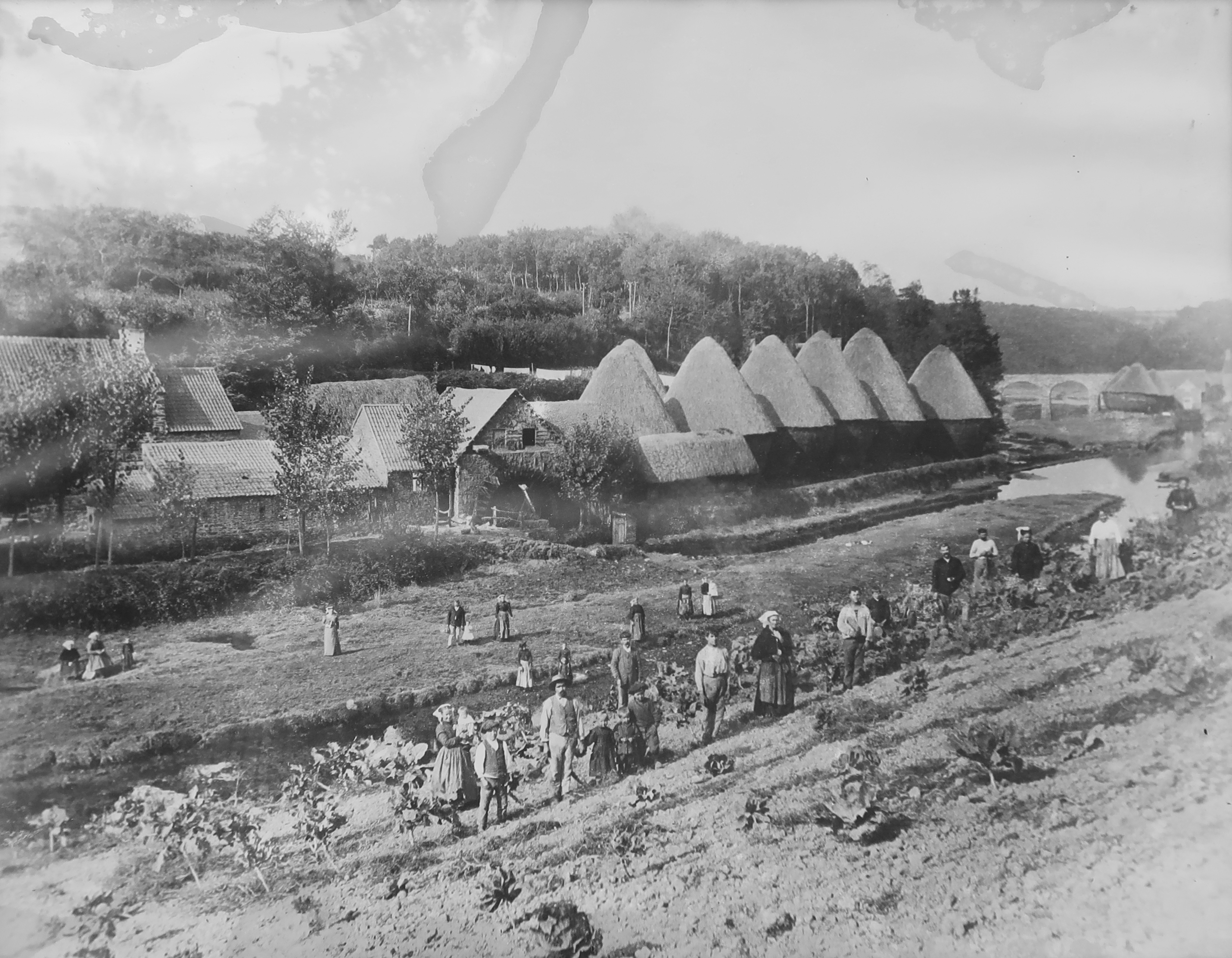 Minihy-Tréguier : vue générale de la vallée du Guindy avec ses moulins à eau, début du 20e siècle (collection particulière de Marie Follezou). A signaler : les meules de lin. Au premier plan, les ouvriers posent... A l'arrière-plan, le pont-aqueducImmatriculation