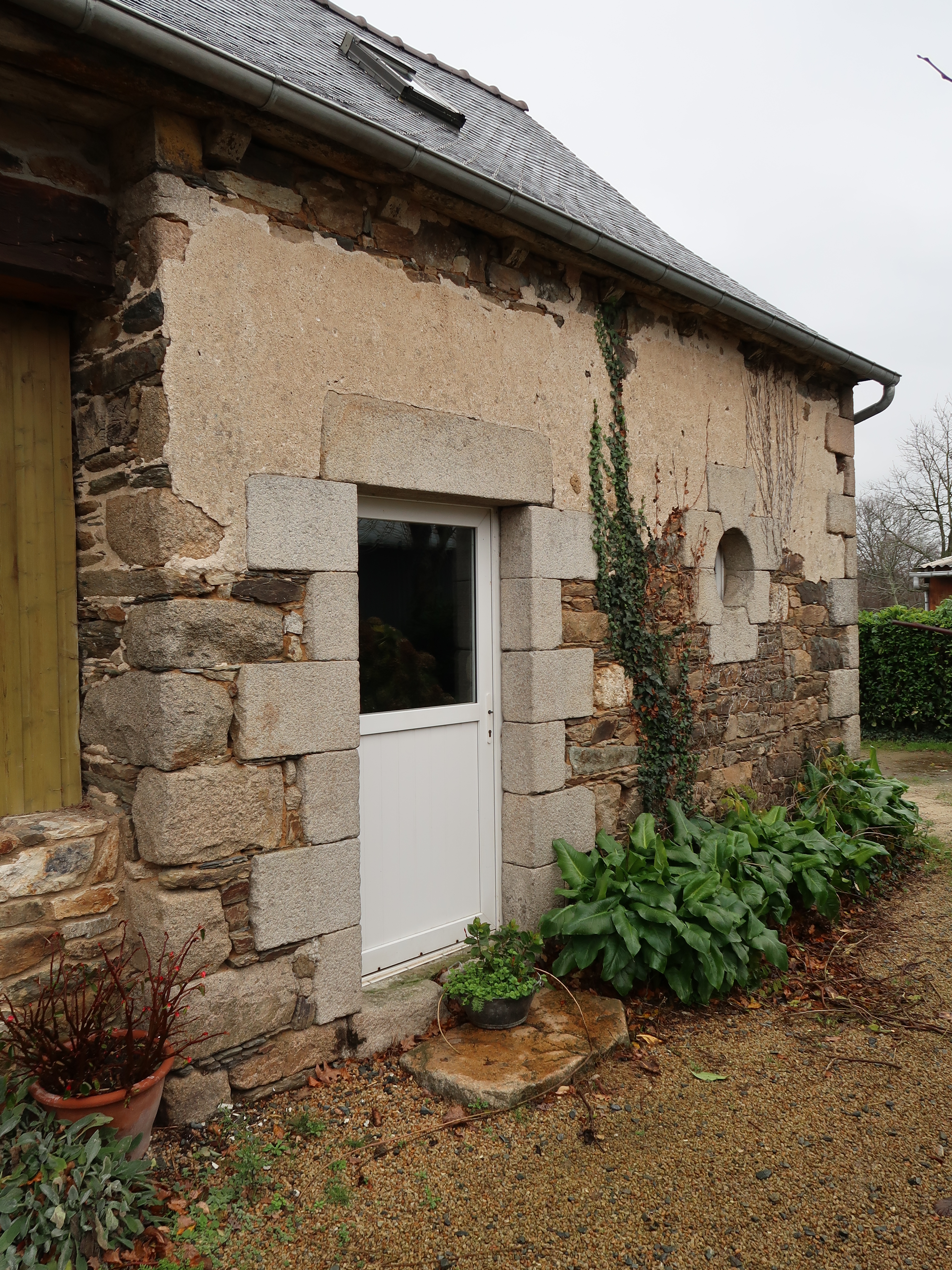 Minihy-Tréguier, le Syet : grange - remise à deux poteaux en bois et à deux occuli, détail de l'élévation sudImmatriculation