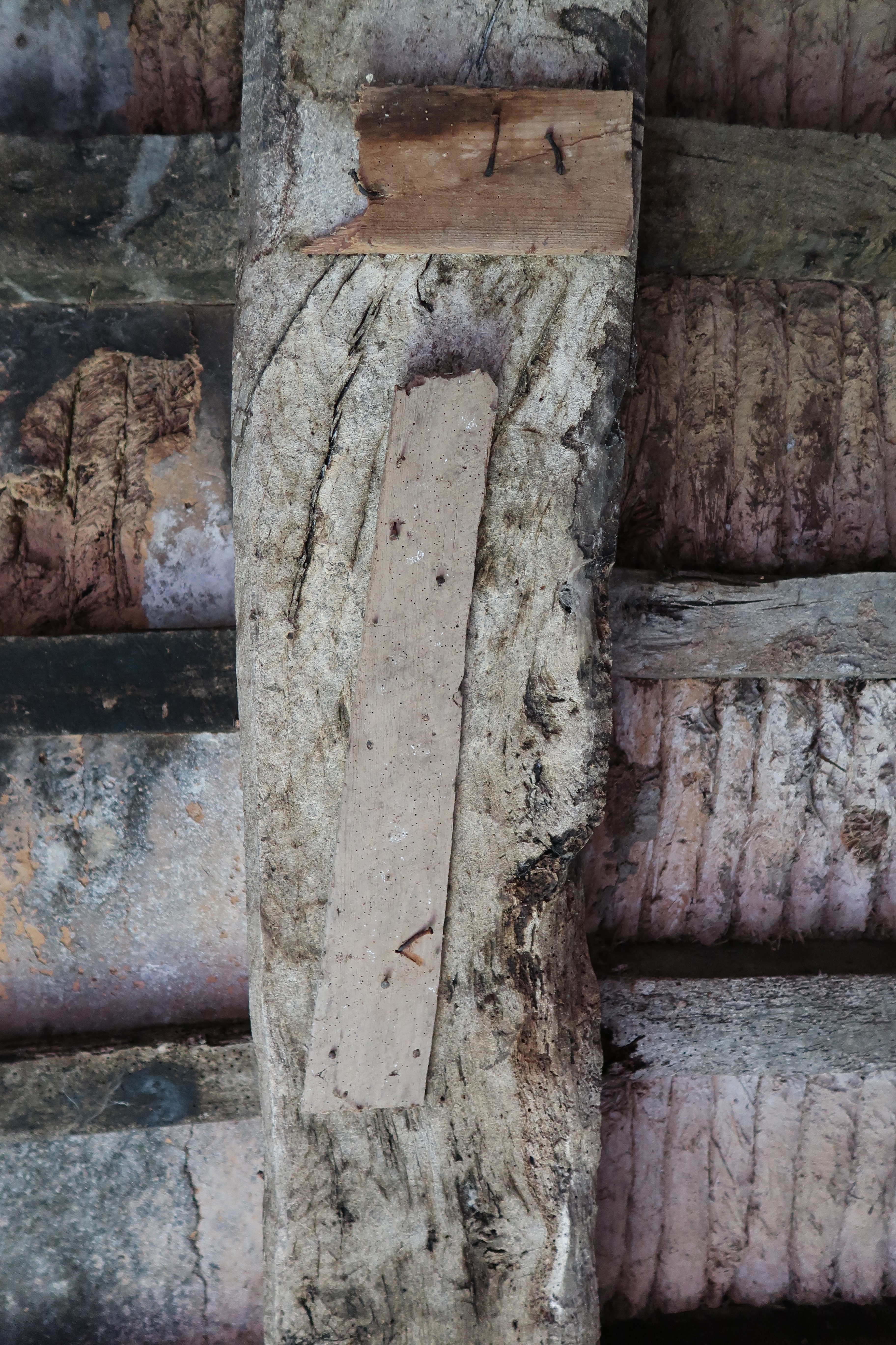 Minihy-Tréguier, le Merdy Bihan : ancien logis actuellement dépendance (désaffectée), détail d'une poutre et d'un plafond garni en "barrasseaux"ou "fusées"Immatriculation