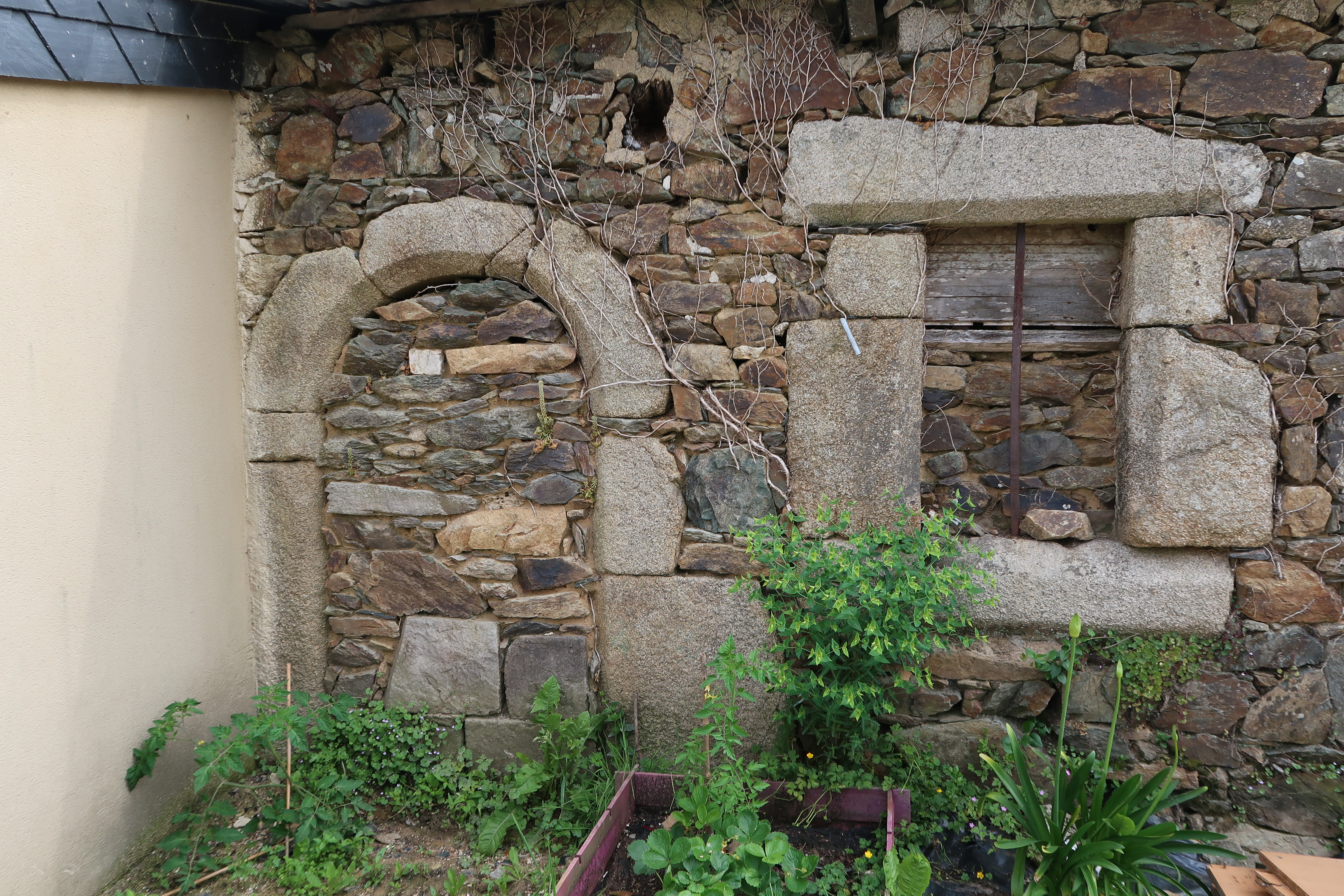 Minihy-Tréguier, le Merdy Bihan : ancien logis actuellement dépendance (désaffectée), détail de l'élévation ouest-sud-ouest, porte et fenêtre (remploi)Immatriculation