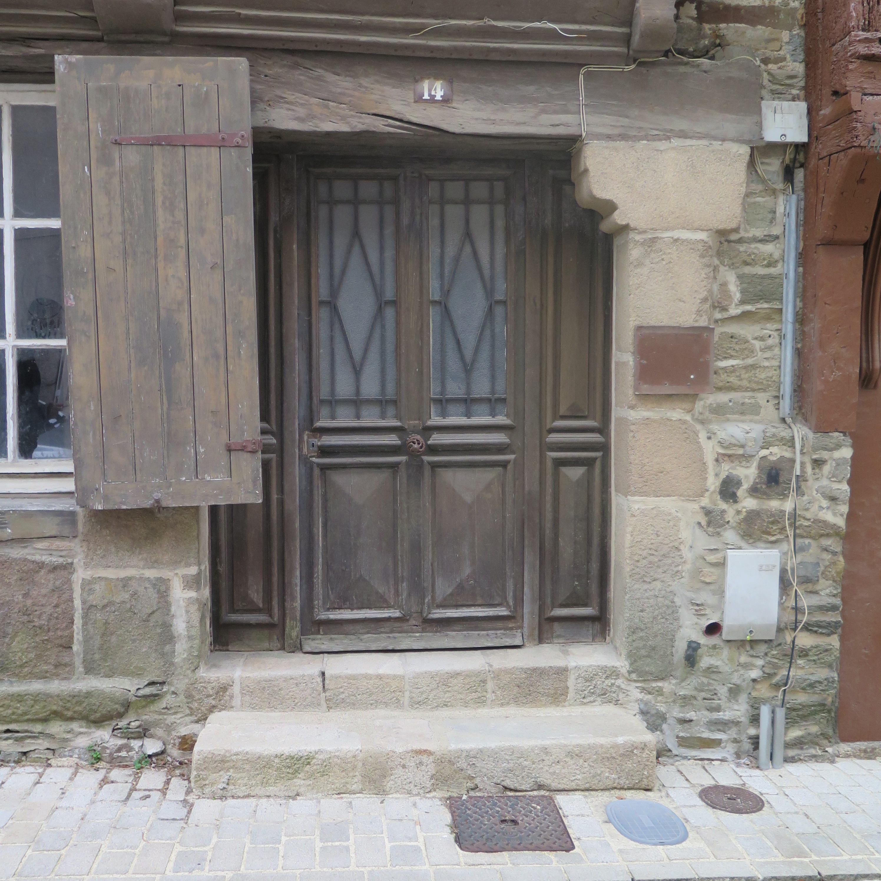 Tréguier, 14 rue Colvestre : maison à pan de bois, façade sud sur rue, détail de la porteImmatriculation