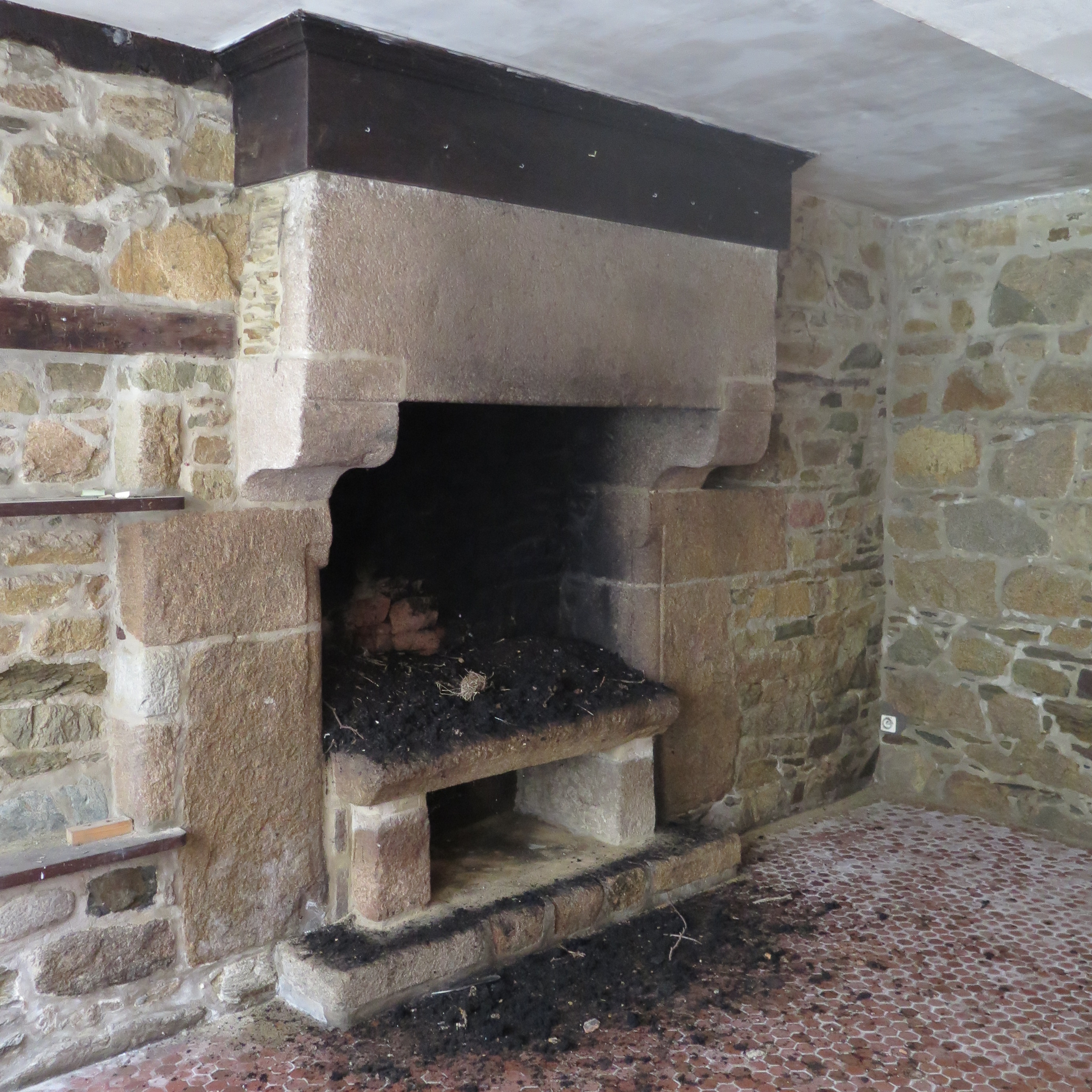 Tréguier, 14 rue Colvestre : maison à pan de bois, rez-de-chaussée, pièce sur rue, détail de la cheminéeImmatriculation