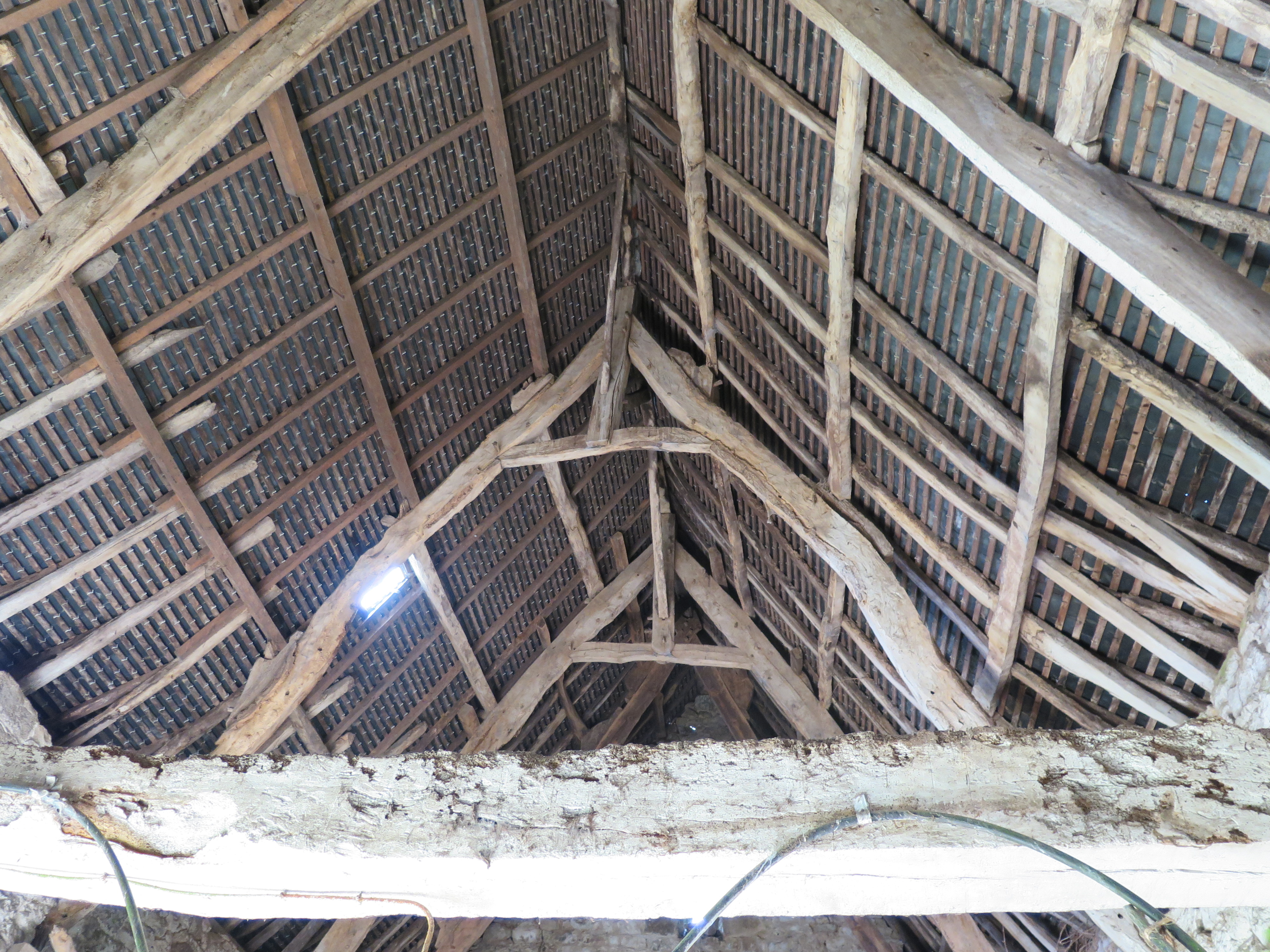 Plouaret, manoir de Guernanchanay : grange, vue de la charpenteImmatriculation