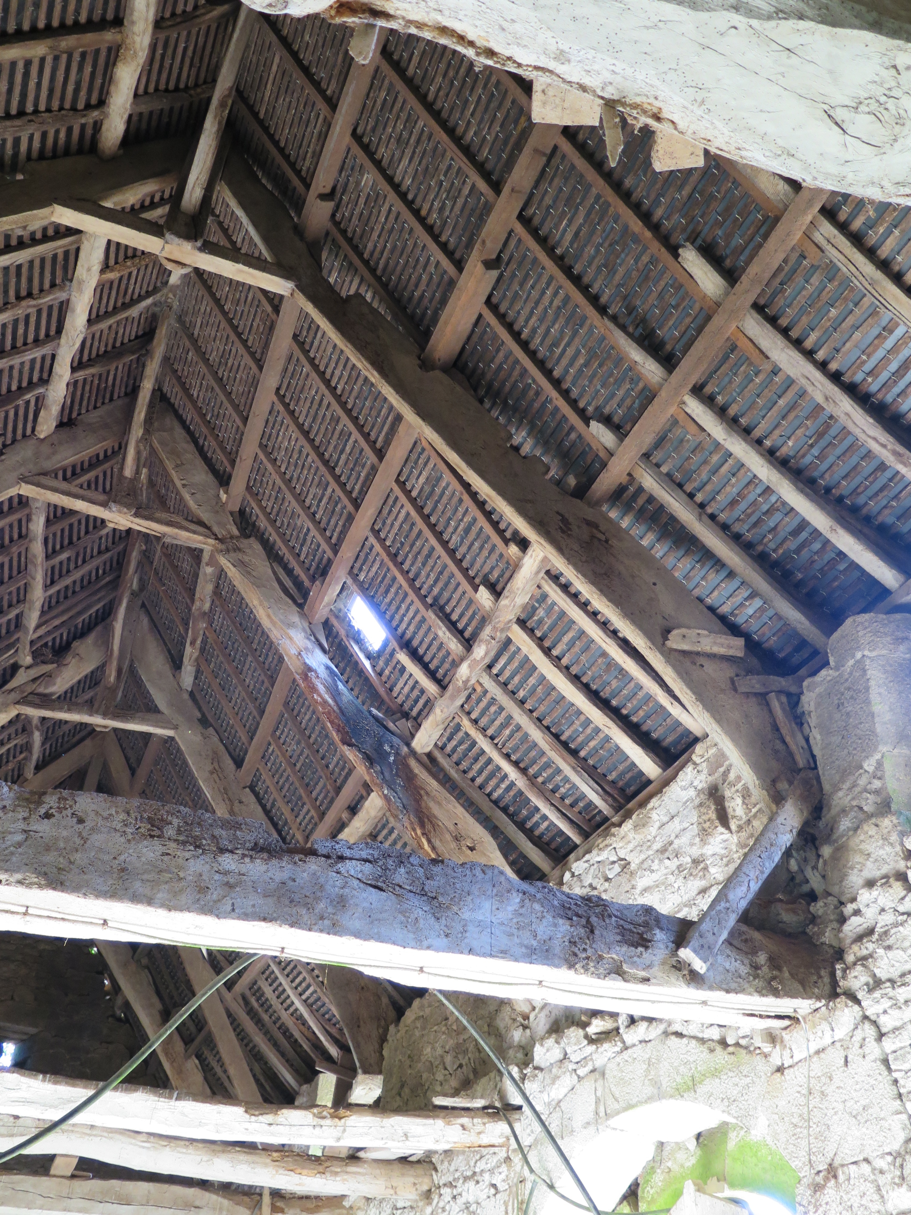Plouaret, manoir de Guernanchanay : grange, vue de détail de la charpenteImmatriculation
