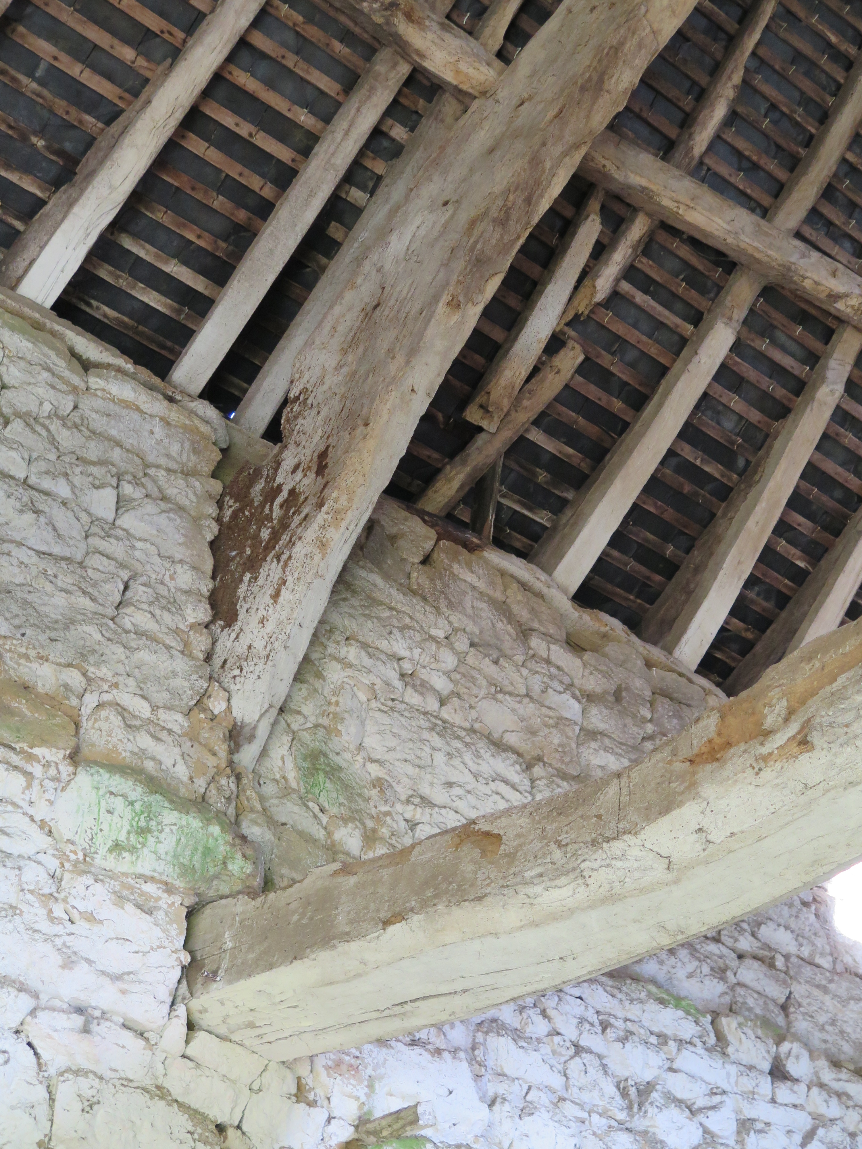 Plouaret, manoir de Guernanchanay : grange, vue de détail de la charpenteImmatriculation