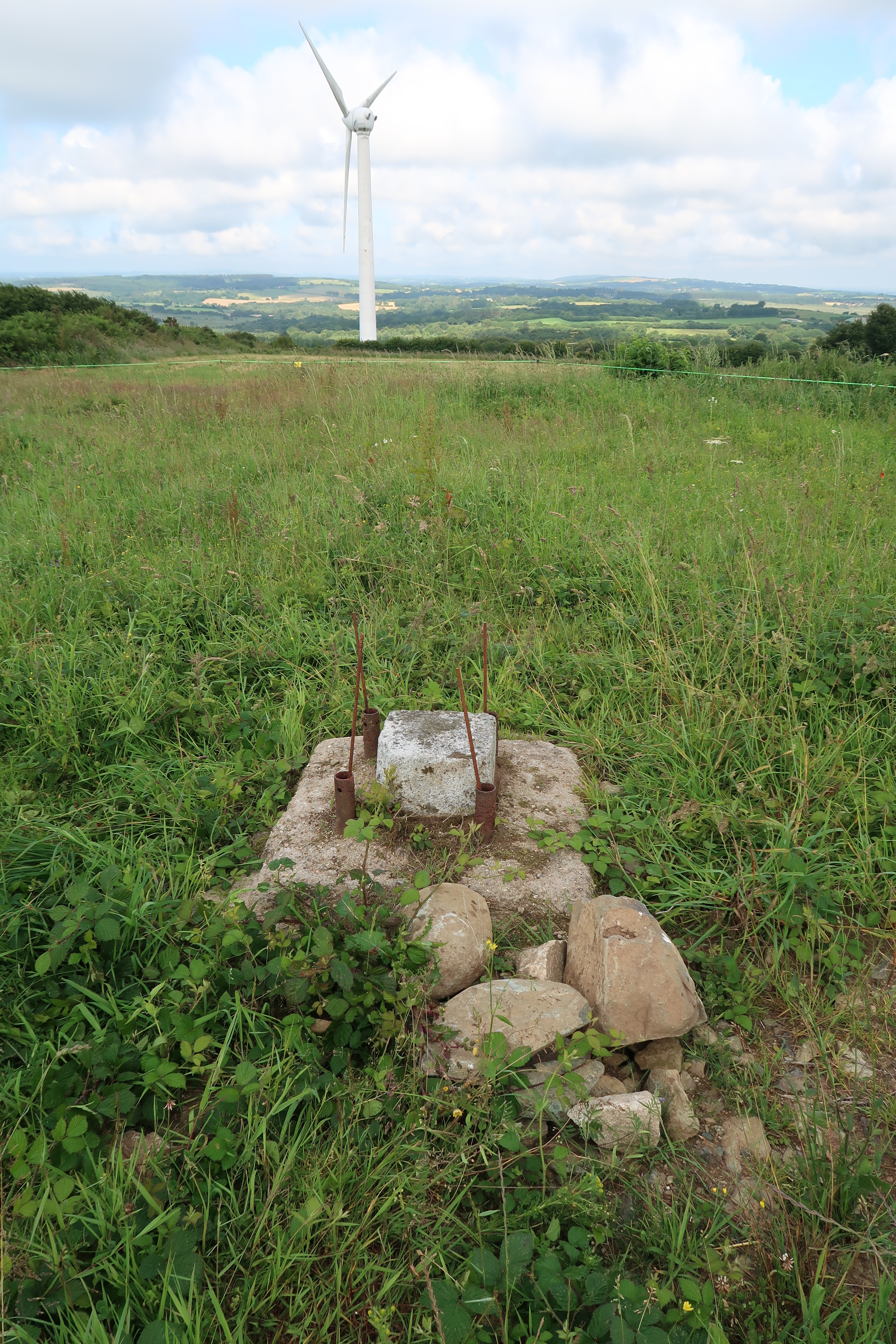 Borne n° 2, état en 2019. Cette borne en granite est fichée dans un massif de béton et entourée de quatre supports métalliques. En arrière-plan : l'éolienne situées à l'ouestImmatriculation