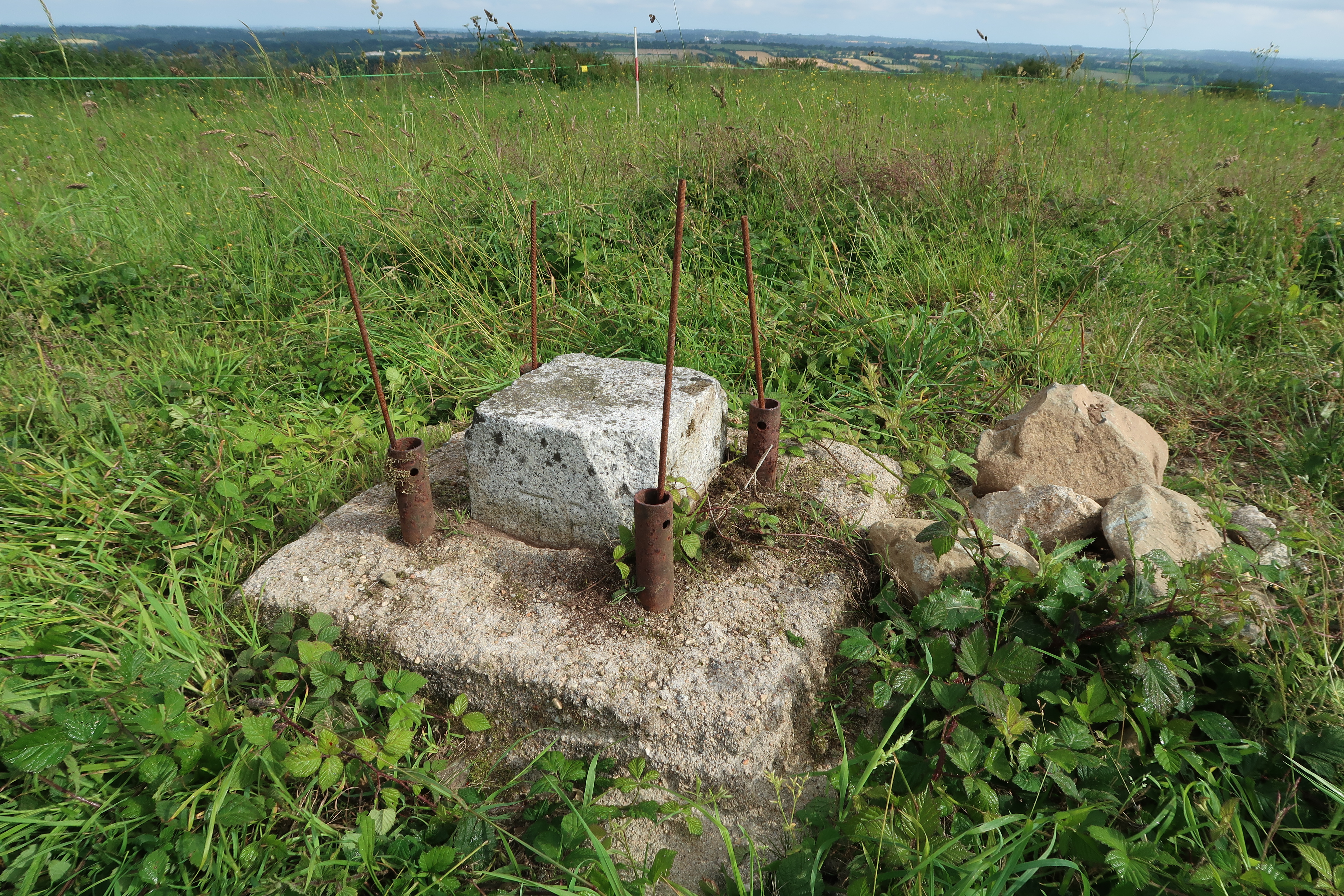 Borne n° 2, face sud portant les initales "TP", état en 2019. Cette borne en granite est fichée dans un massif de béton et entourée de quatre supports métalliquesImmatriculation