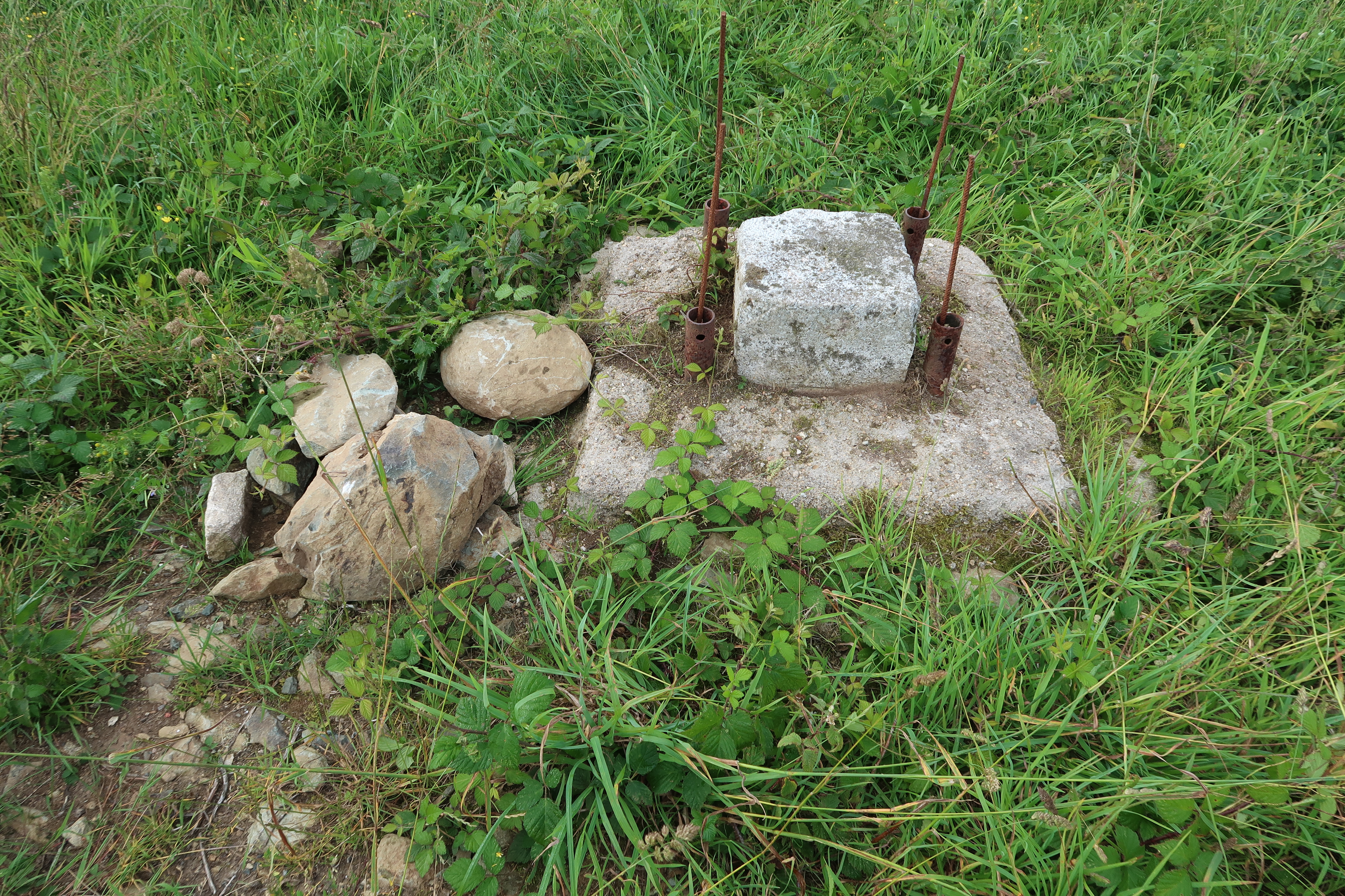 Borne n° 2, face nord ornée d'un triangle, état en 2019. Cette borne en granite est fichée dans un massif de béton et entourée de quatre supports métalliquesImmatriculation