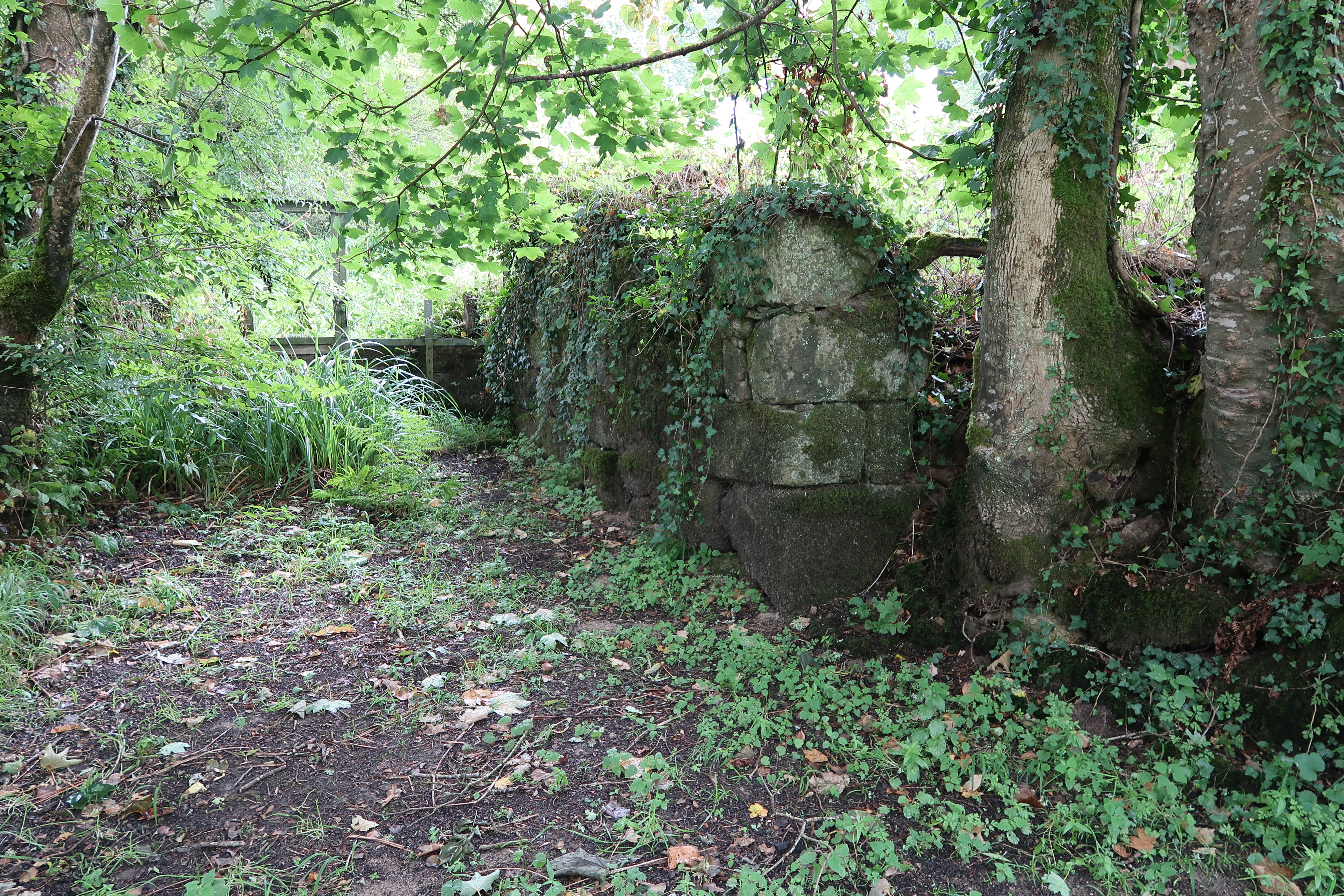 Vanne et canal de décharge du moulin (état en 2019). Au premier plan : mur de soutènement en pierre de taille de graniteImmatriculation