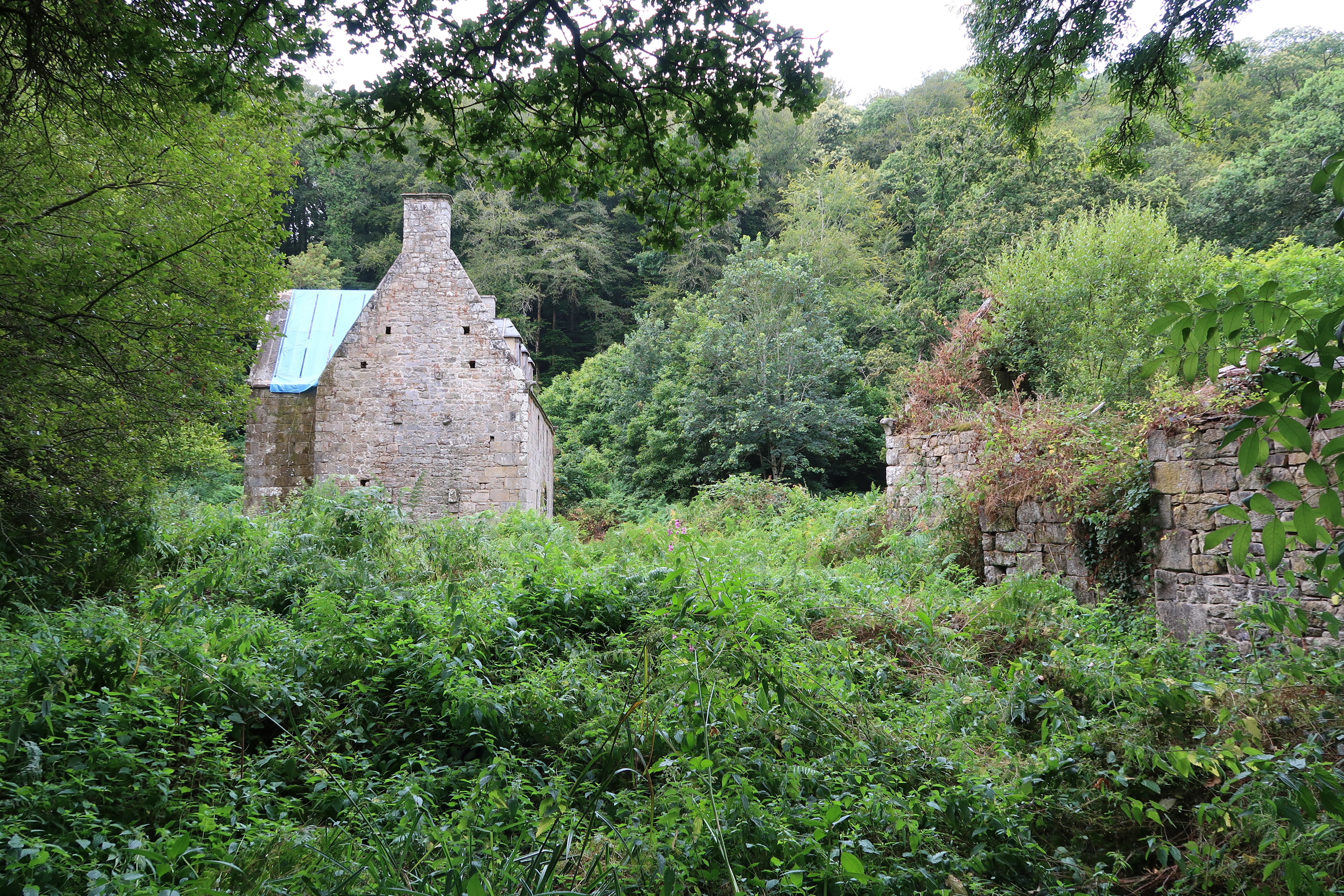 Moulin (à droite, sous la végétation) et son logis, vue de situation (état en 2019)Immatriculation