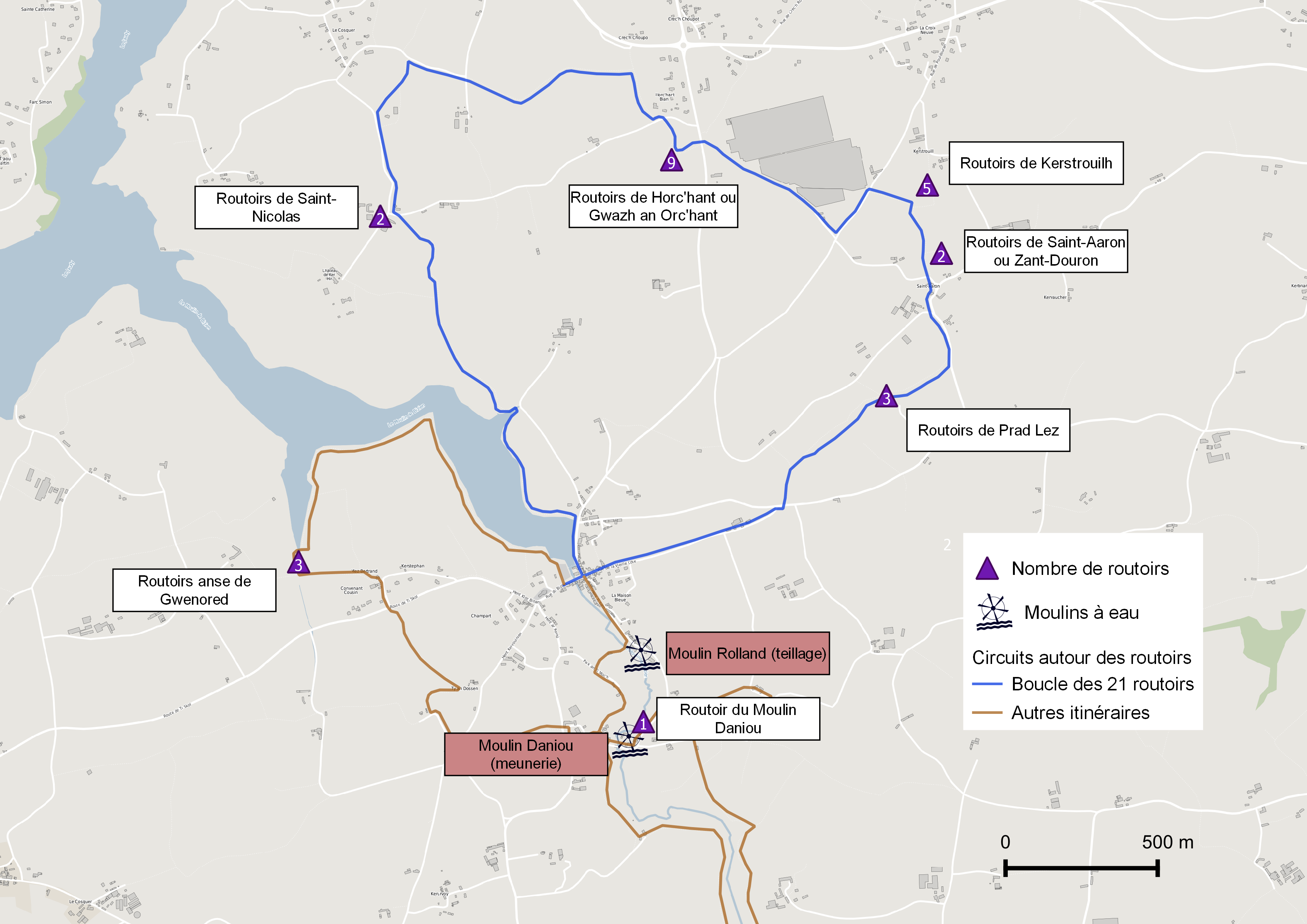 Le patrimoine linier autour de Pouldouran : circuit sur les 21 routoirs et localisation des moulinsImmatriculation