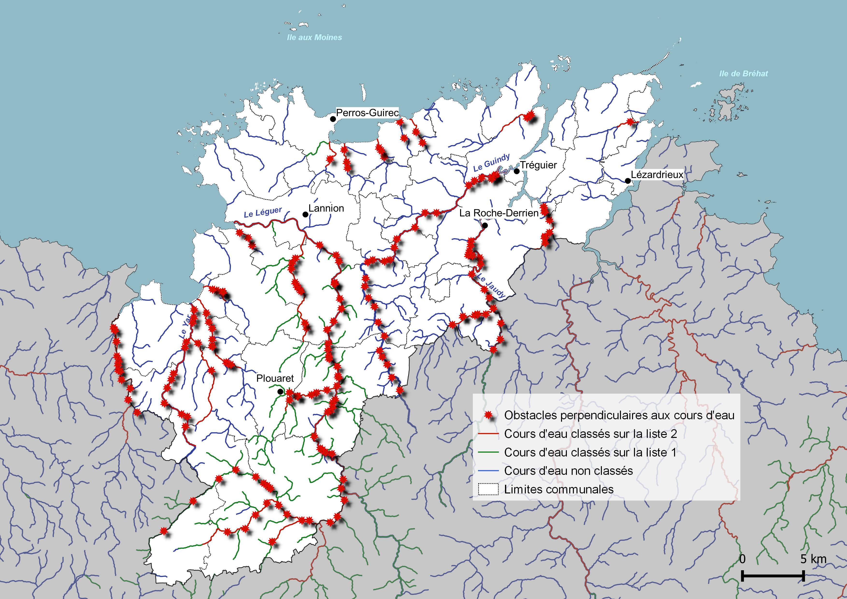 Couche des obstacles à la continuité écologique : DREAL Bretagne, Obstacles perpendiculaires au cours d’eau du SRCE Bretagne.