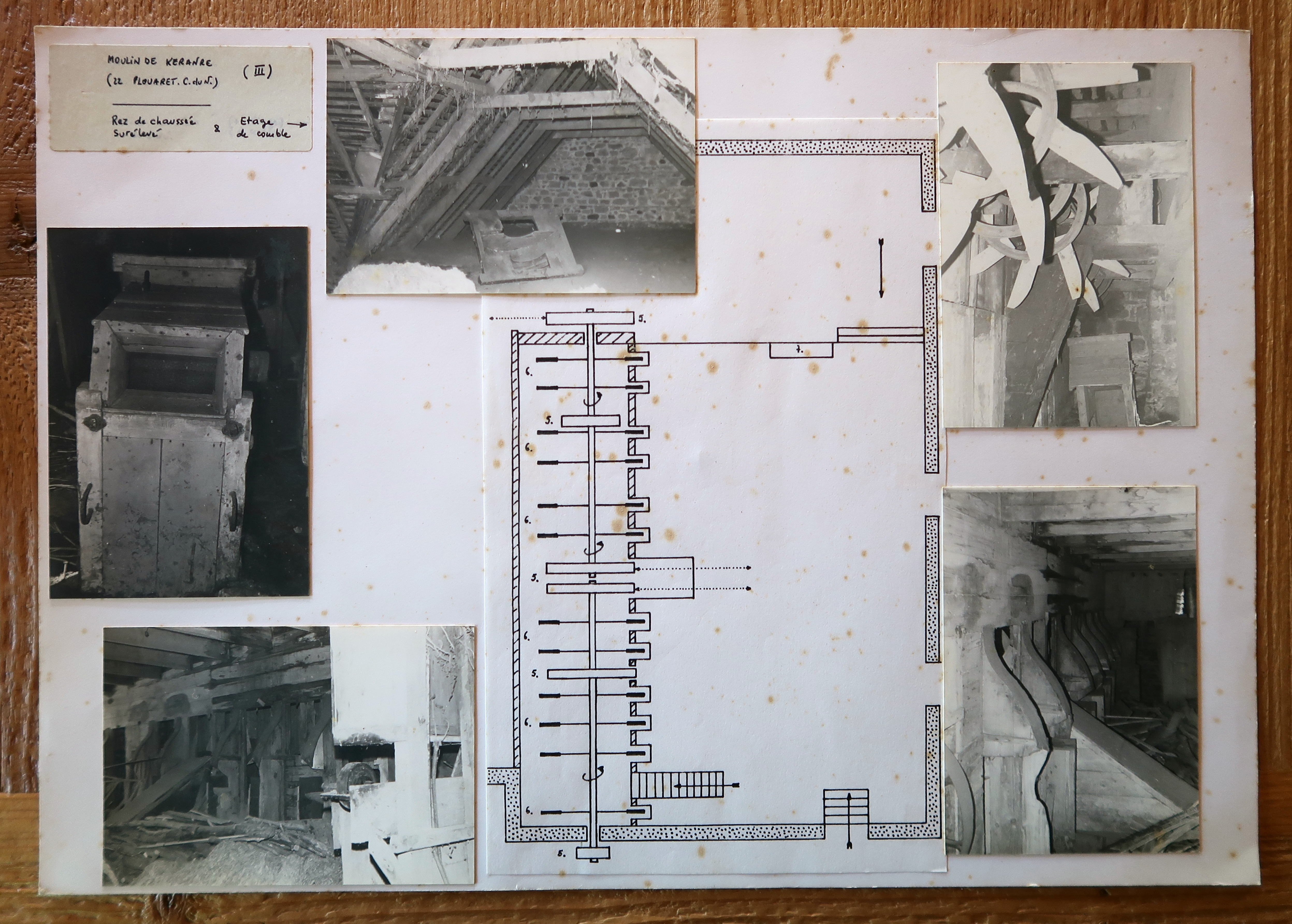 Planche n° 3 : plan du rez-de-chaussée surélevé avec l'emplacement des machines et photographies de l'état ancien par Jean-Yves Andrieux (non daté, vers 1990)Immatriculation