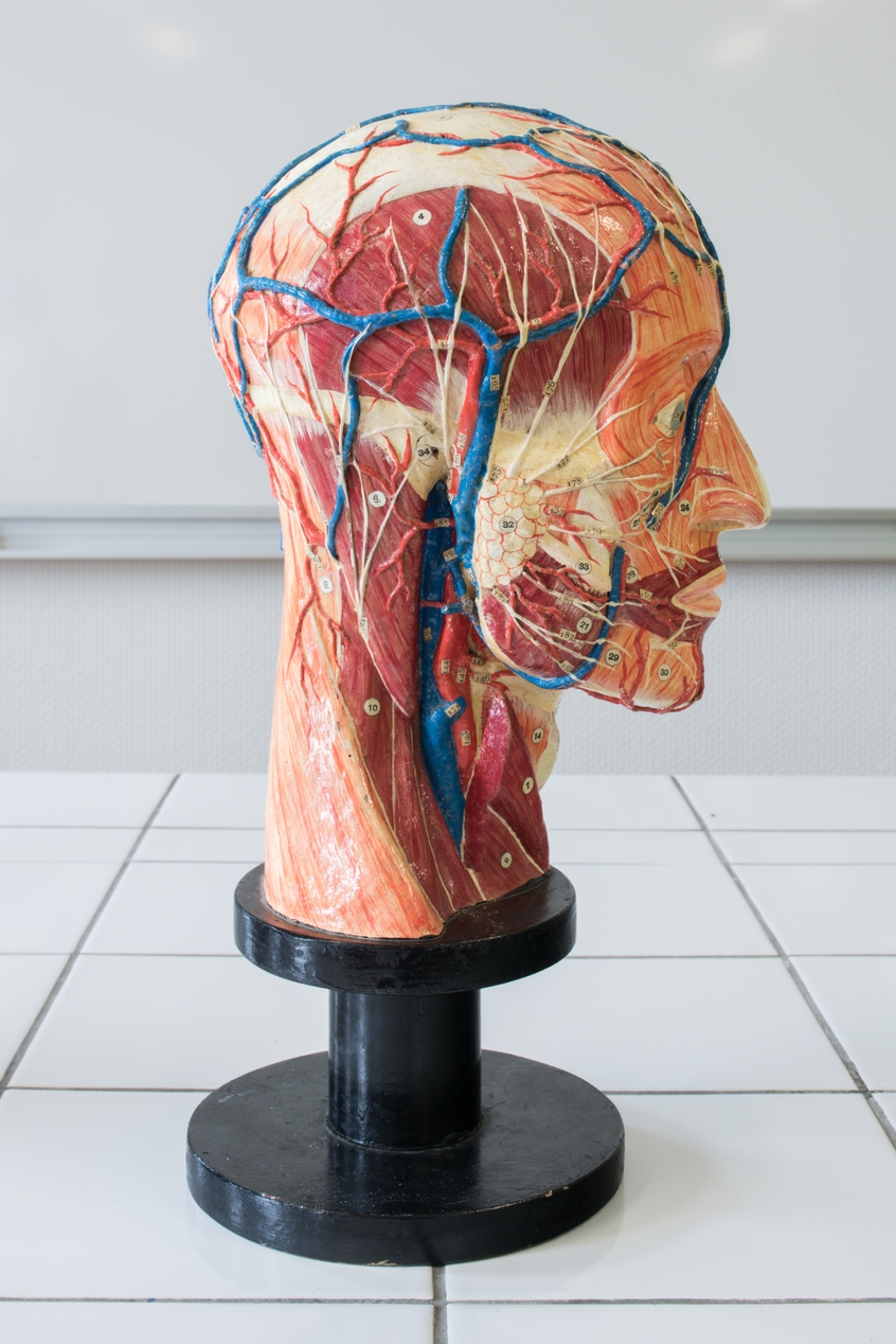 Coupe sagittale de boîte crânienne écorchée - Modèle d'anatomie en plâtre (Etablissements du Docteur Auzoux, 1956Immatriculation