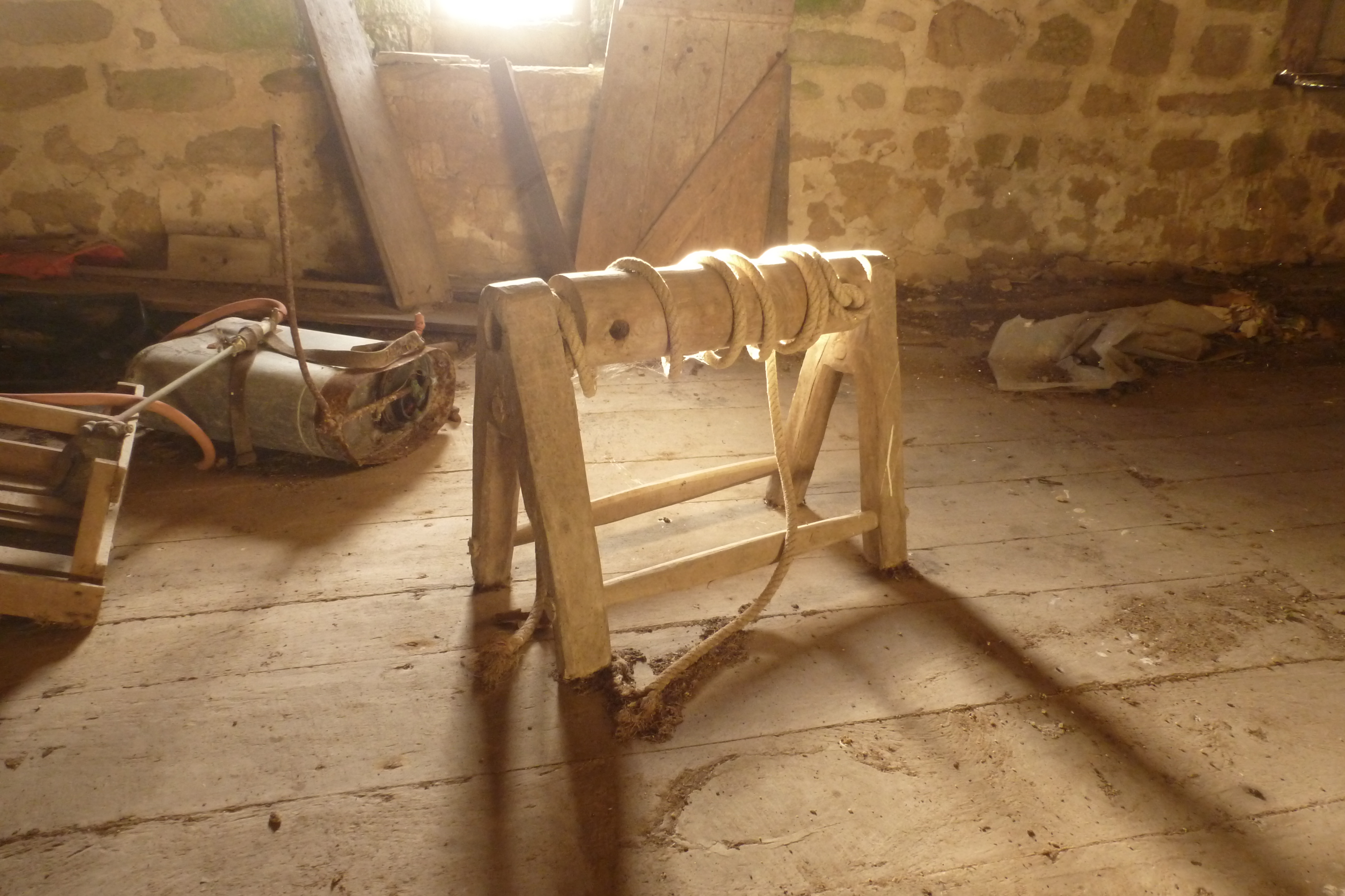 Etage, treuil en bois pour hisser le cochon. (2019)Immatriculation