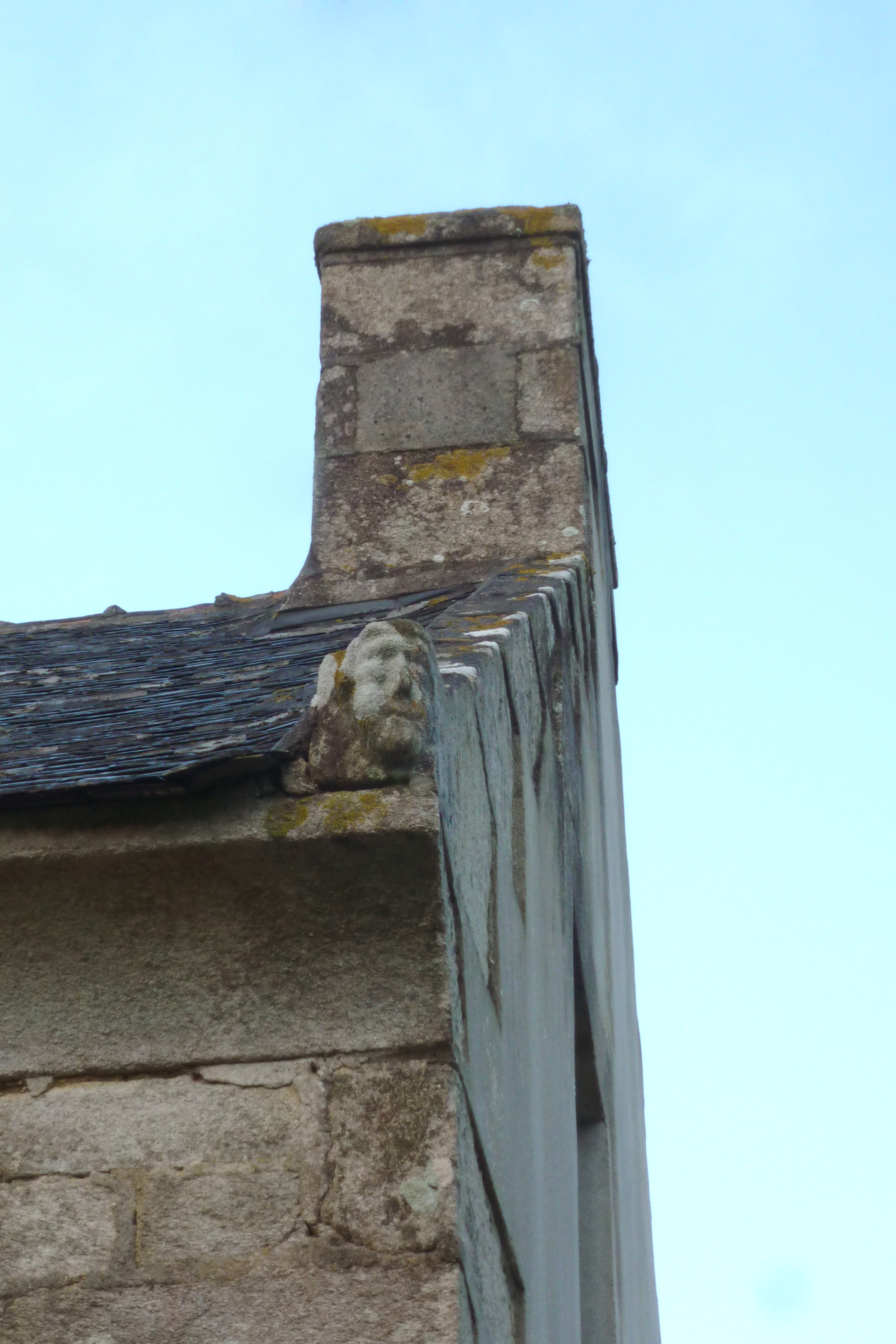Logis, détail de la tête sculptée sur l'angle sud est.Immatriculation