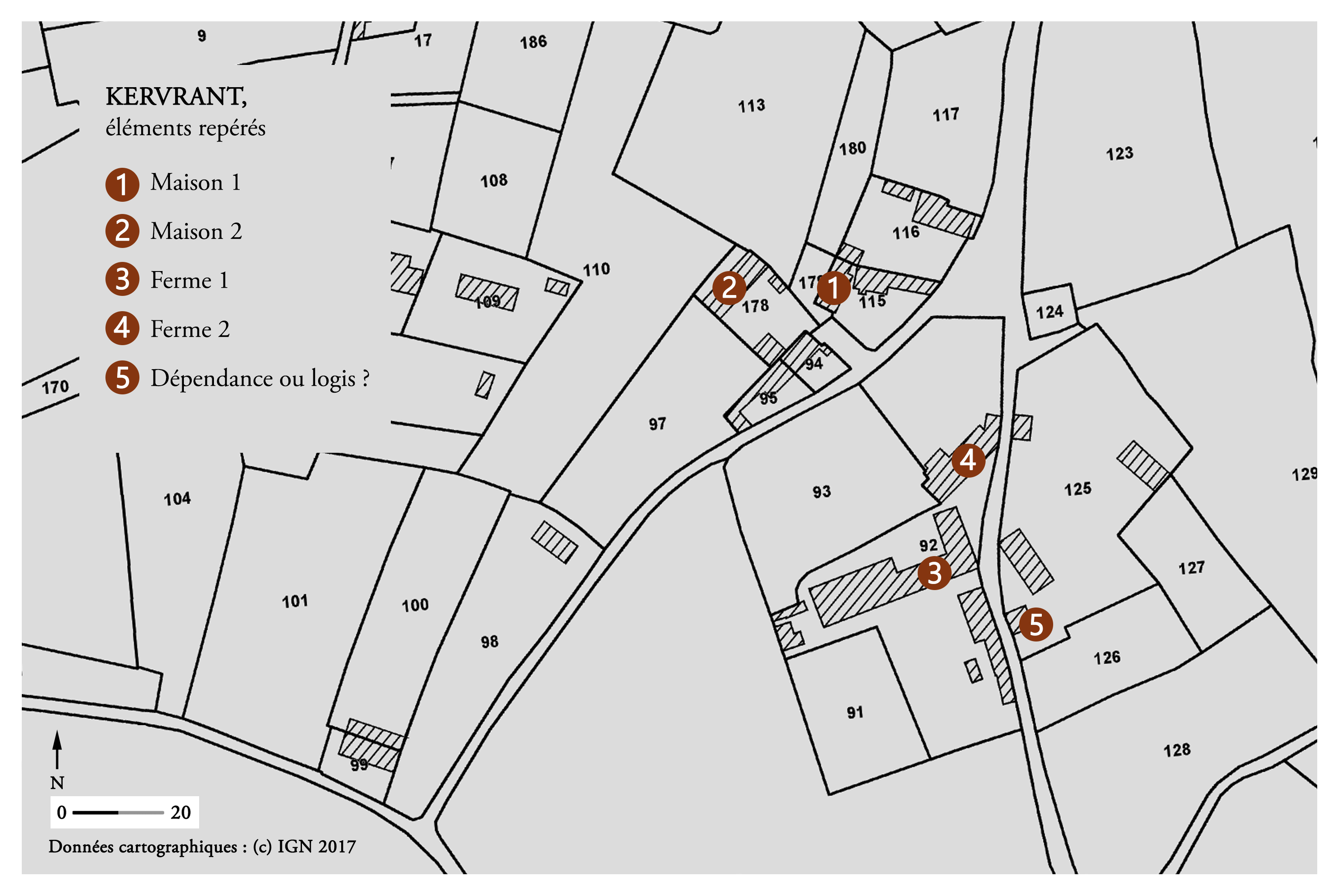 Village de Kervrant, éléments repérés. Fond : cadastre 2018.Immatriculation