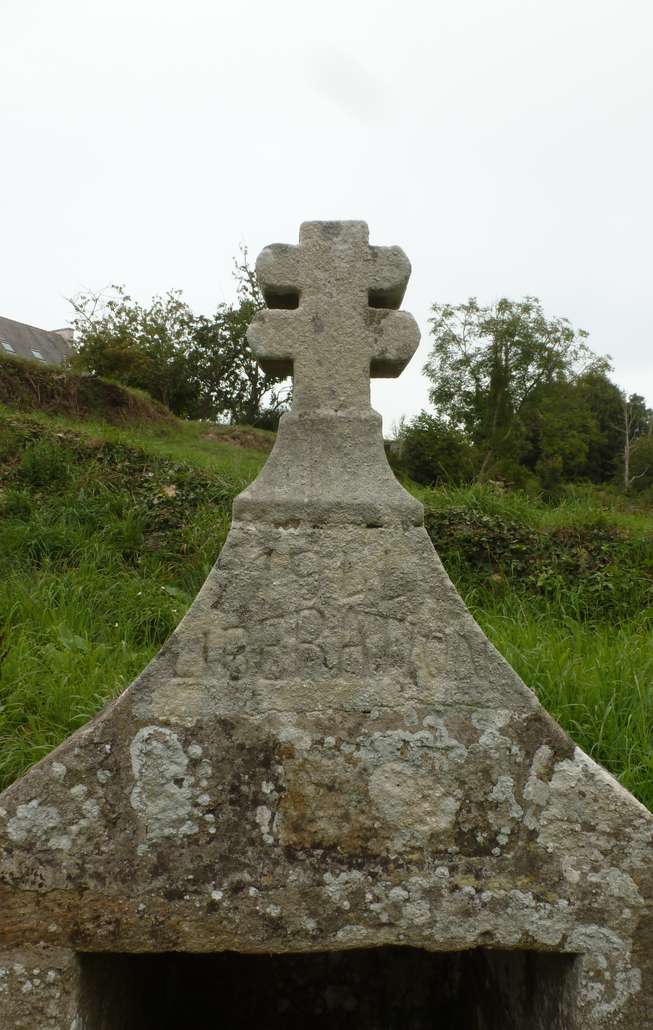 Fontaine au sud de Kerandraon, détail du fronton. Croix de lorraine et inscription "1944 Libération"Immatriculation