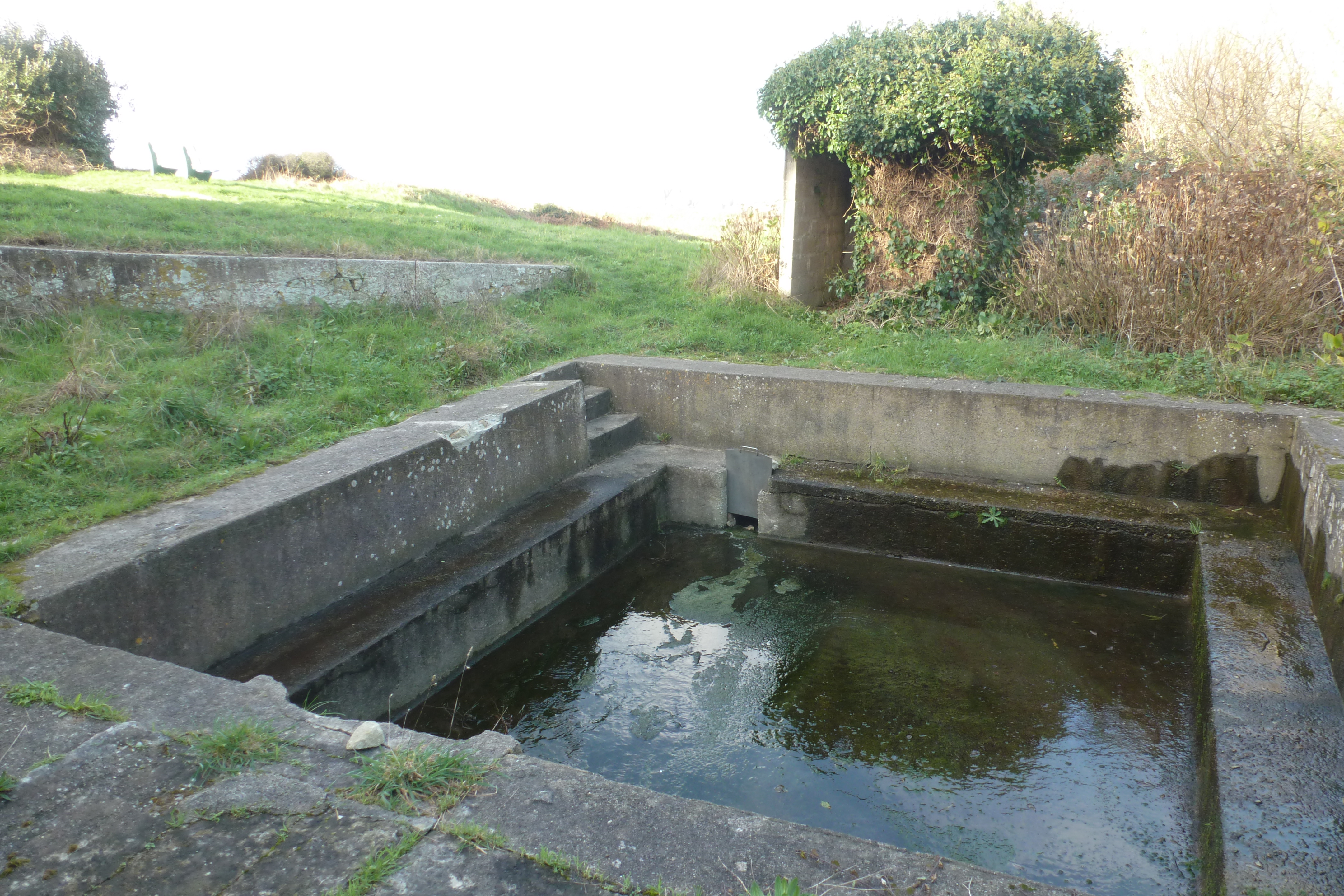 Lavoir de Laoual sud, vue générale prise du sud-est, évacuation de l'eau et cabane des laveuses.Immatriculation